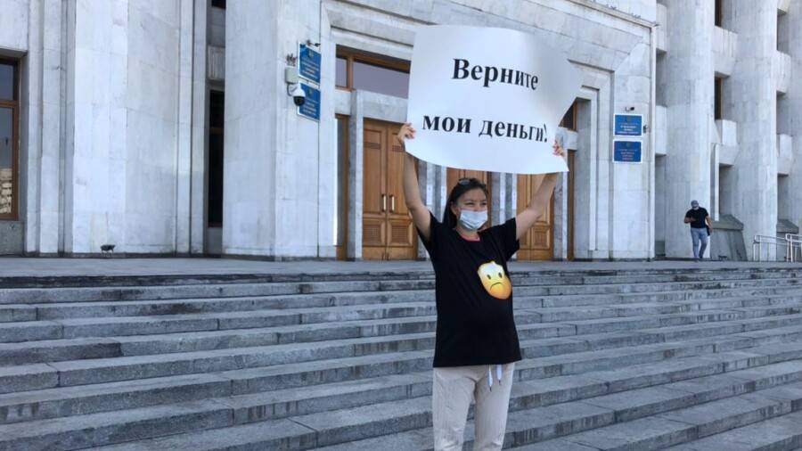 Журналист informburo.kz Жанна Хабдулхабар провела одиночный пикет у акимата Алматы с требованием выплатить гарантированные государством полную сумму декретных, которые ей урезали.