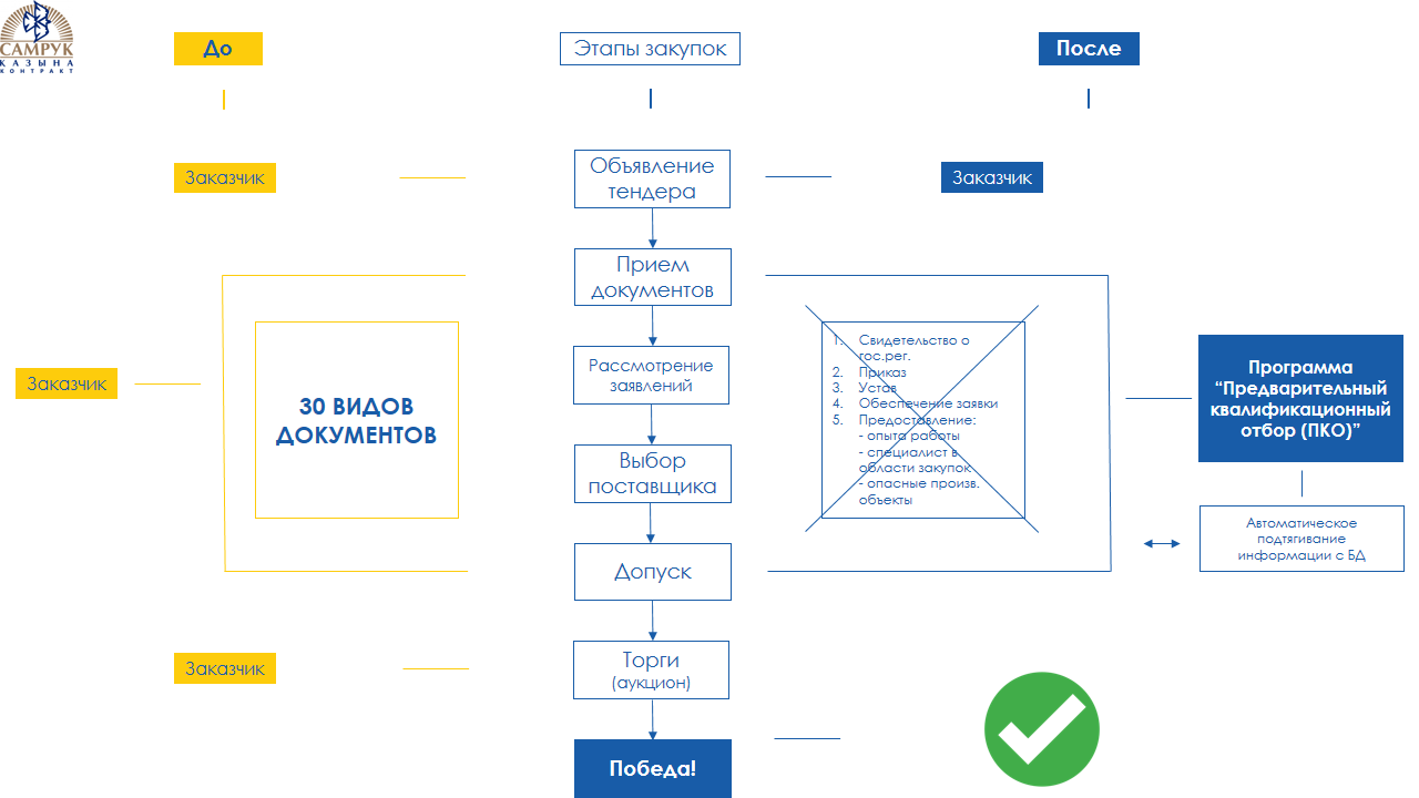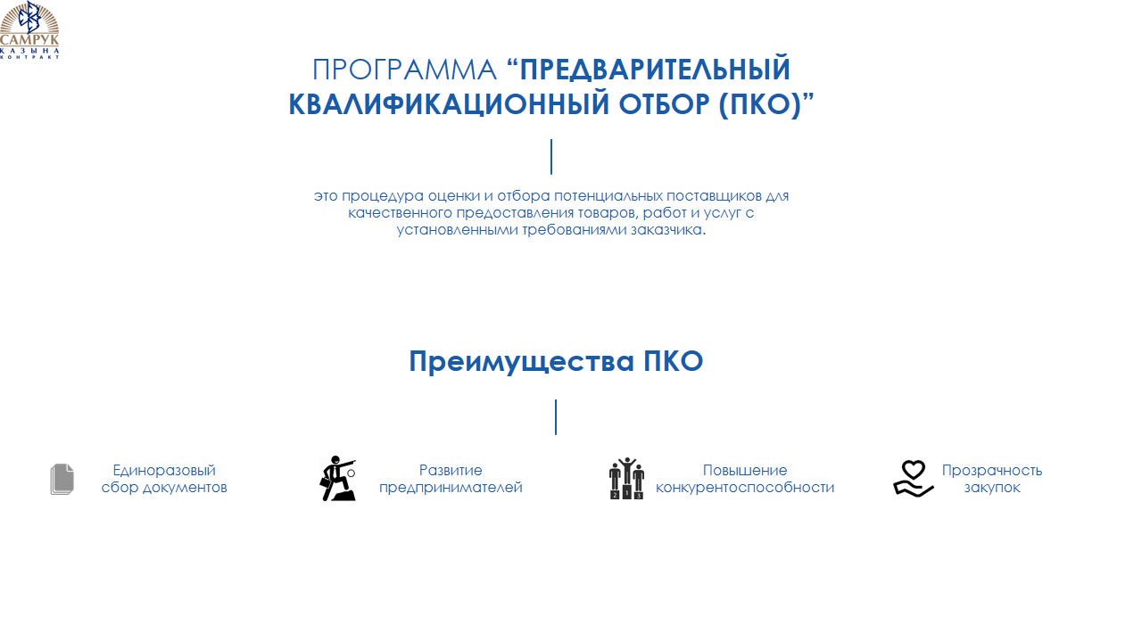 "Самрук-Казына" нашёл решение вопроса поиска надёжных поставщиков. С 3 апреля компании группы фонда начали закупать товары, работы и услуги только у тех предпринимателей, которые вошли в перечень предварительно квалифицированных поставщиков. С 2018 года все конкурентные закупки национальных компаний будут проводиться только среди предпринимателей, прошедших ПКО.
