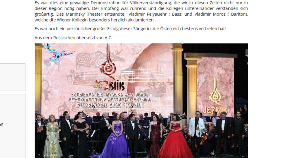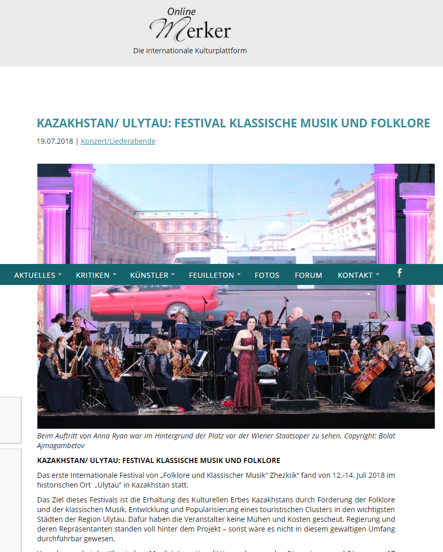 В то же время в Австрии авторитетный специализированный журнал "NewMerker" и международный культурный интернет-портал "Online-Merker" также опубликовали репортаж о фестивале в Улытау. В центре внимания корреспондентов изданий было выступление австрийской оперной певицы Анны Риан.