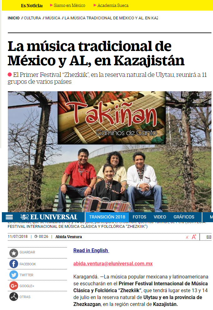 Крупнейшие мексиканские газеты "ElUniversal" и "La vozdeMichoacan", международный журнал об оперном искусстве "NewMerker", выпускающийся в Австрии, интернет-портал "Peruanosensuiza" и другие издания из разных стран рассказали своим читателям о фестивале этнической музыки "Жезкиiк", прошедшем в июле в Улытау Карагандинской области.