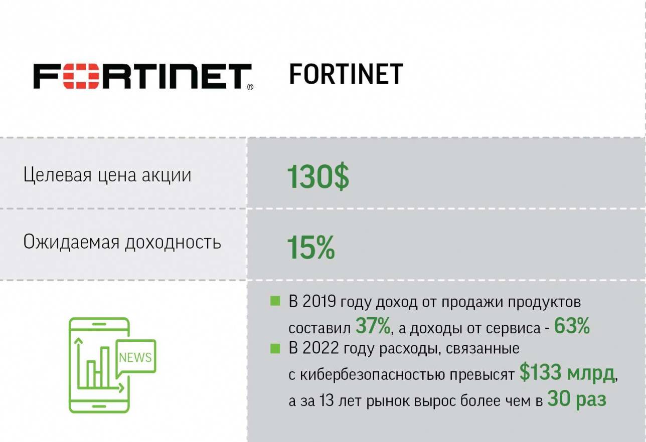Основанная в 2000 году FTNT занимается производством аппаратно-программных комплексов сетевой безопасности, а также продаёт услуги, связанные с организацией систем безопасности. В 2019 году доход от продажи продуктов составил 37%, а доходы от сервиса – 63%. Мировой рынок кибербезопасности находится на подъёме. Расходы, связанные с кибербезопасностью, в 2022 году превысят $133 млрд, а за 13 лет рынок вырос более чем в 30 раз.
