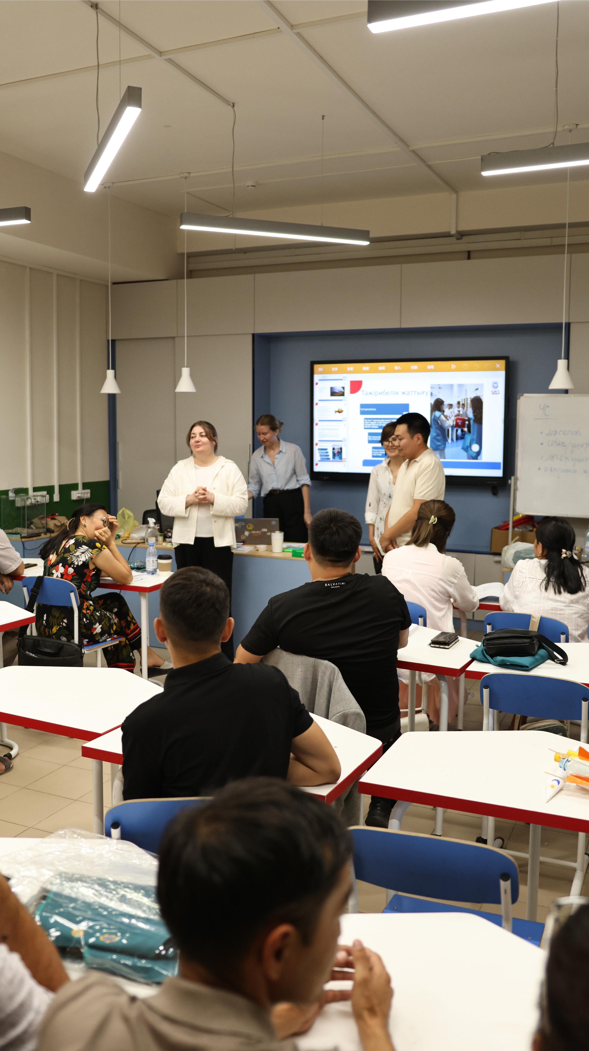 В небольшой аудитории РФМШ идёт урок, но за партами не дети, а учителя. Они активно отвечают на вопросы тренера, выходят командами по несколько человек к доске и декламируют стихи на тему "Что делать во время землетрясения" – домашнее задание. На каждой парте пособие "Проект SAQ: развитие культуры безопасного поведения школьников". Содержание включает цели и компетенции офицера SAQ, теорию ЧС, безопасное поведение при угрозах и план школы по безопасности.