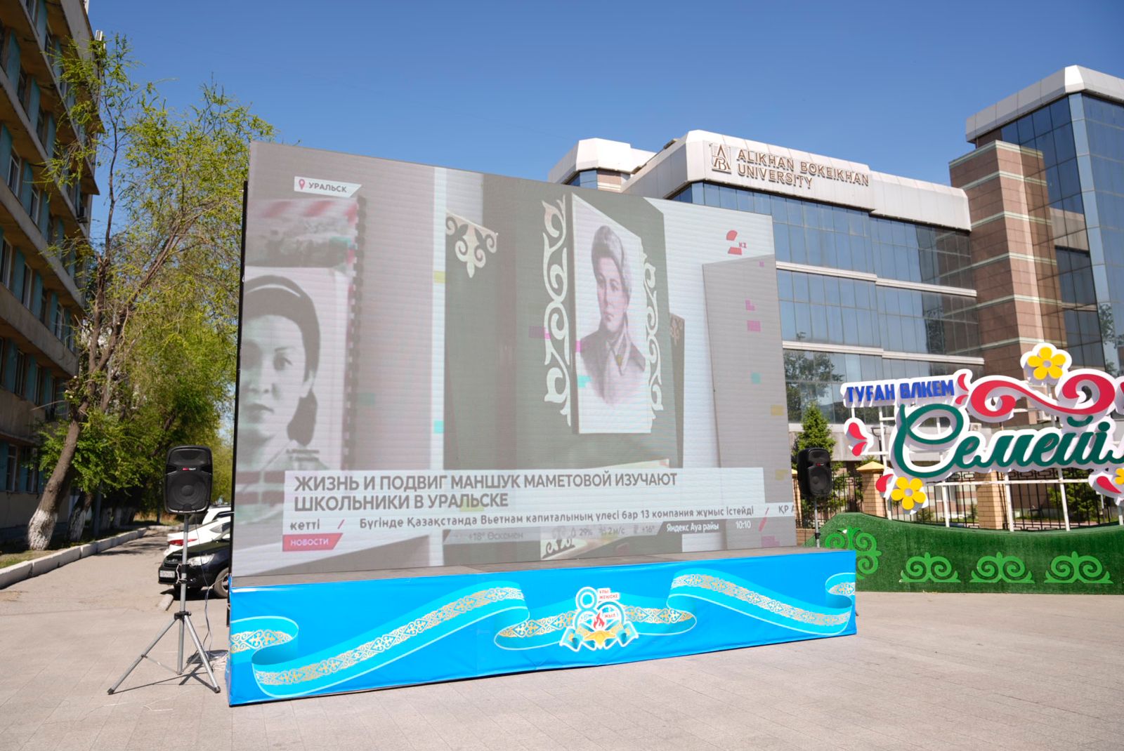 Семейчане собрались на городском Арбате в областном центре, чтобы посмотреть военный парад. Ветераны, депутаты областного маслихата, представители политических партий, гражданского общества и молодёжь собрались у LED-экрана.