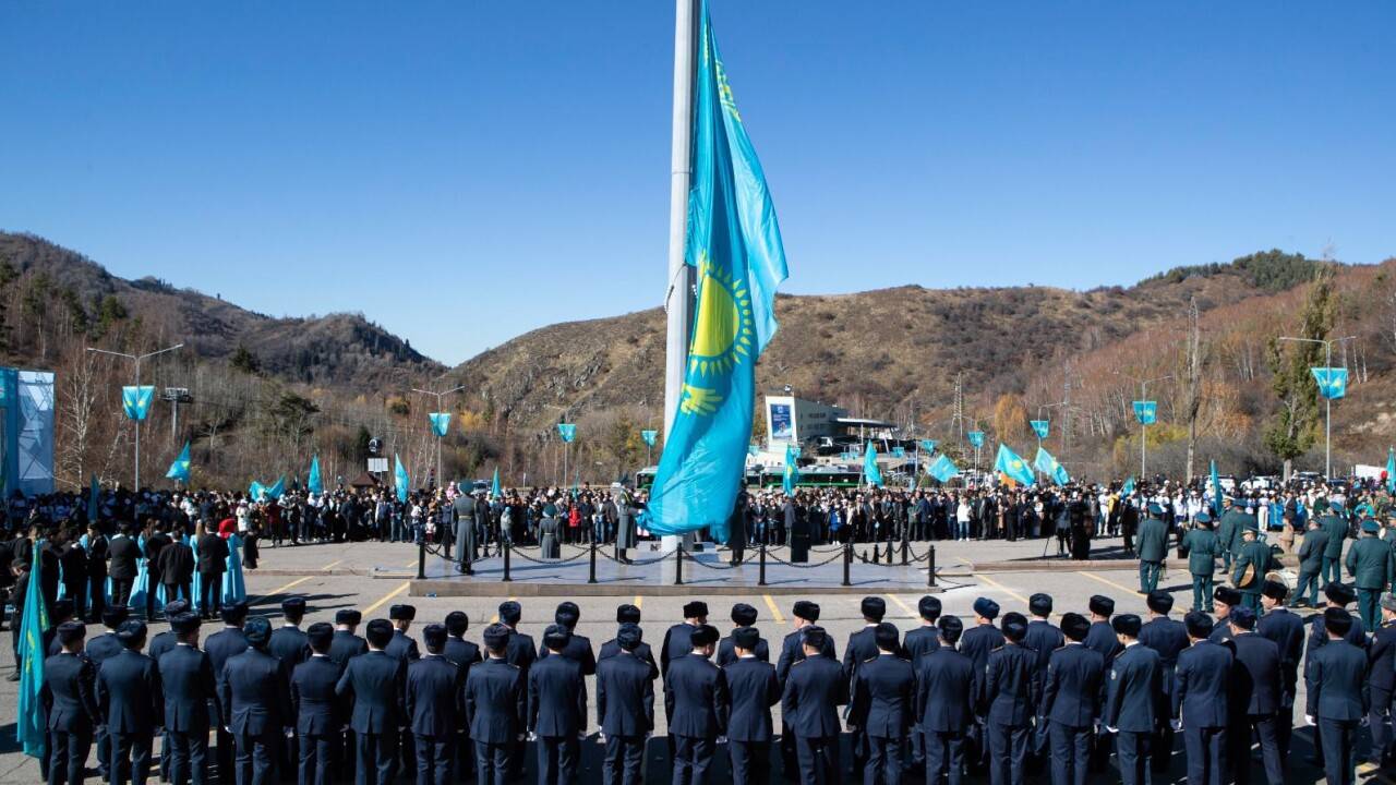 В торжественной церемонии поднятия флага на площадке у ледового катка "Медеу" приняли участие аким Алматы Ерболат Досаев, общественные деятели, депутаты маслихата, представители неправительственных и молодёжных организаций, а также рядовые горожане.