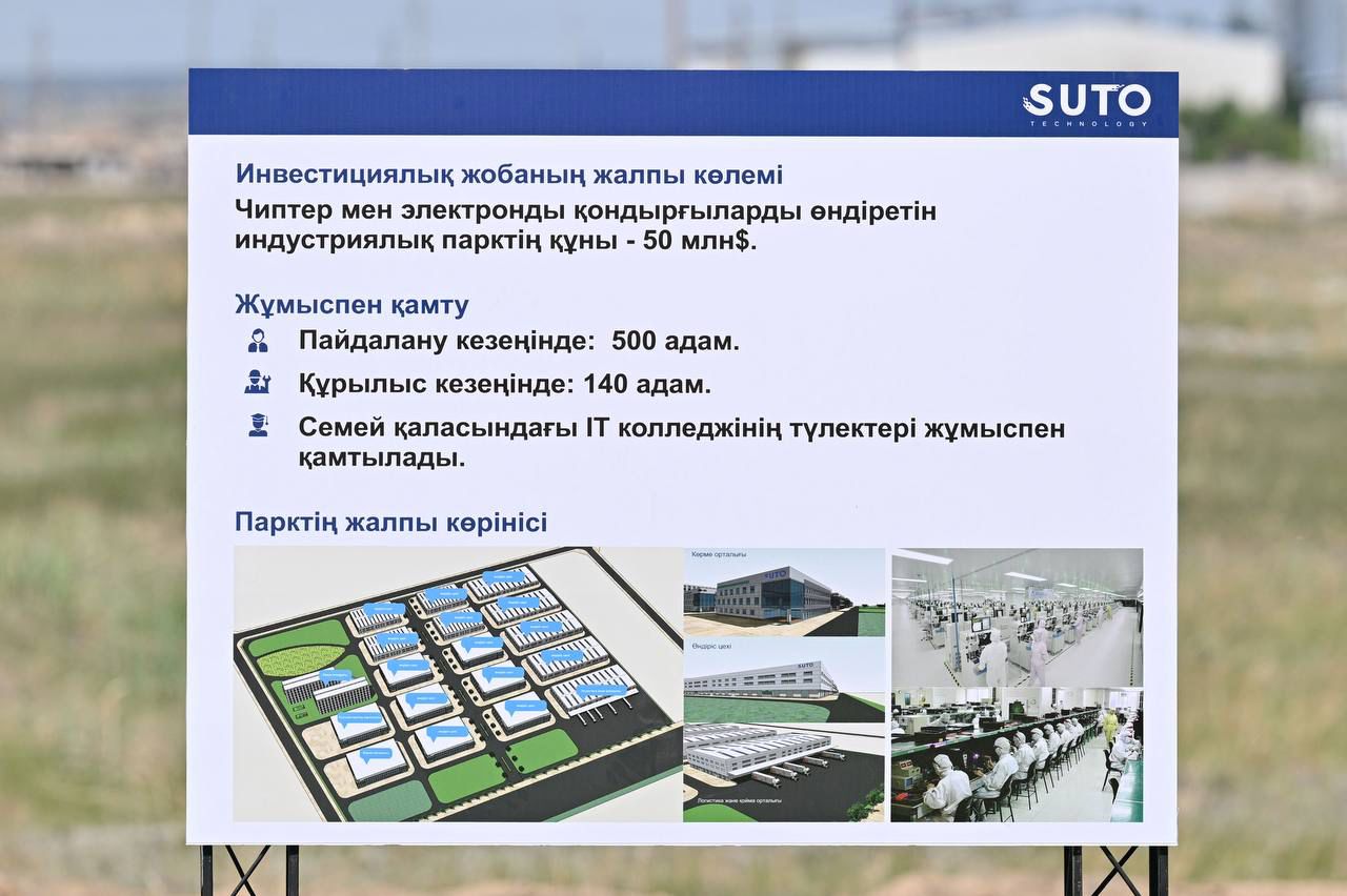 Проект реализует казахстанско-китайская совместная компания ТОО "Suto Kazakhstan" на территории индустриальной зоны «Өндіріс» в Семее. На новом предприятии будут производить чипы, оптоэлектронные модули, интеллектуальные хост-контроллеры, блоки питания, энергосберегающие лампы и электронные дисплеи.