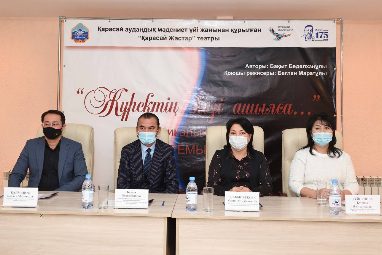 Перед показом состоялась пресс-конференция с участием заместителя акима Карасайского района Кульжан Дуйсеновой, заместителя председателя Союза писателей, автора Бакыта Альдибекова и руководителя театра "Карасай жастары" Баглана Калманова. Модератором выступила заместитель руководителя культуры, архивов и документации Алматинской области Алия Жакыпбекова.