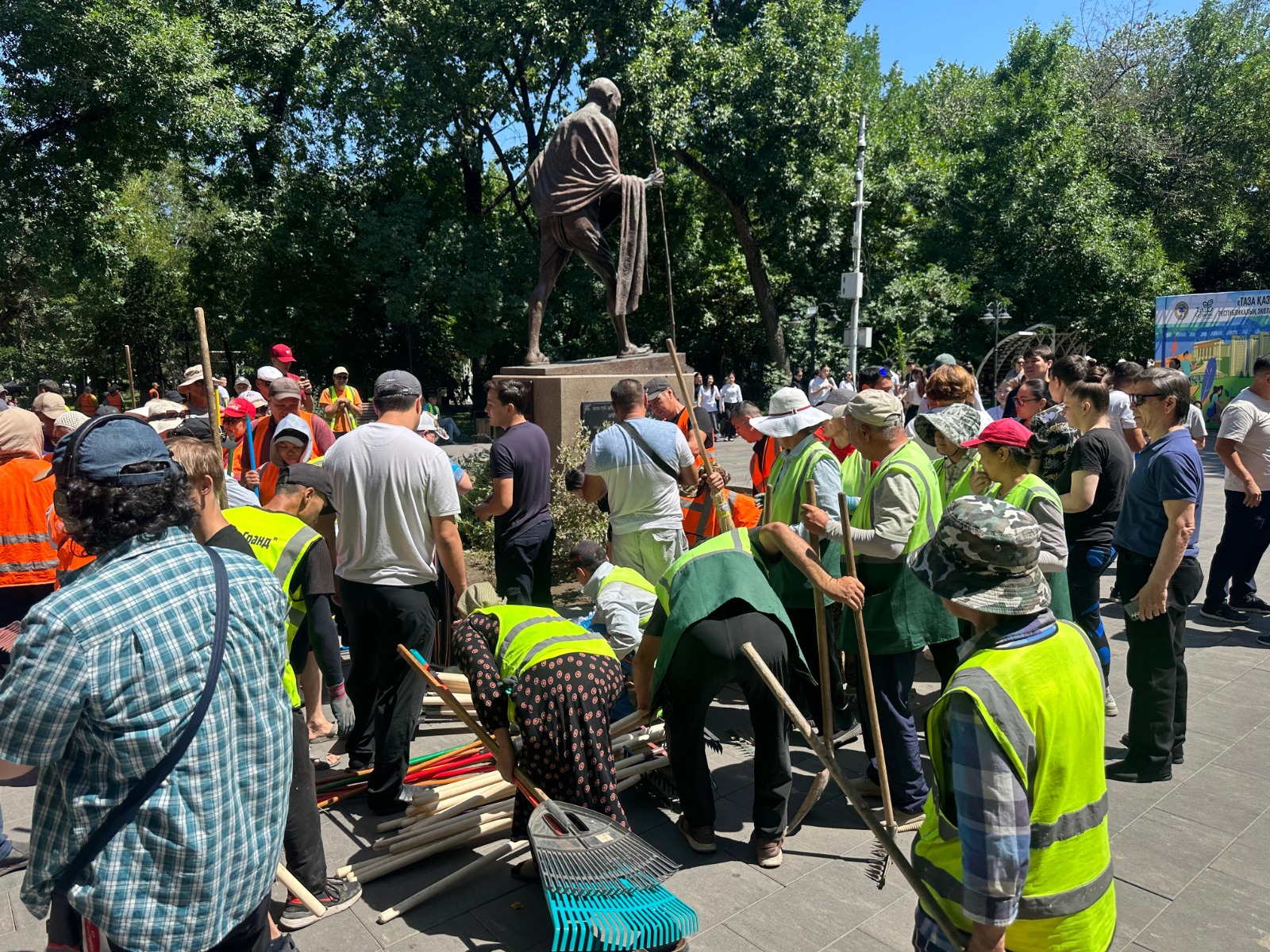 С самого утра, ровно в 10:30, участники начали собираться в двух точках – в парке имени Махатмы Ганди и на перекрёстке улиц Прокофьева и Дуйсенова. В числе добровольцев были волонтёры, представители бизнеса и медицины, а также жители района, работники акимата и социальных служб, однако большую часть составили сотрудники коммунальных служб района – их число составляло около 450 человек.
