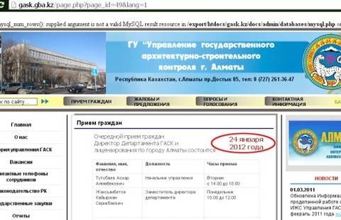 Закон «Об административных процедурах» обязывает все госорганы страны создать и поддерживать в рабочем состоянии веб-сайты. Это пусть и небольшая, но гарантия прозрачности работы чиновников: на сайте необходимо размещать законы и нормативные документы, а также отвечать на вопросы граждан. Это часть обеспечения работы электронного правительства в Казахстане – и один из приоритетов правительства реального. Но, судя по всему, не приоритет департамента архитектурного контроля и лицензирования Алматы (ДГАСКЛ).