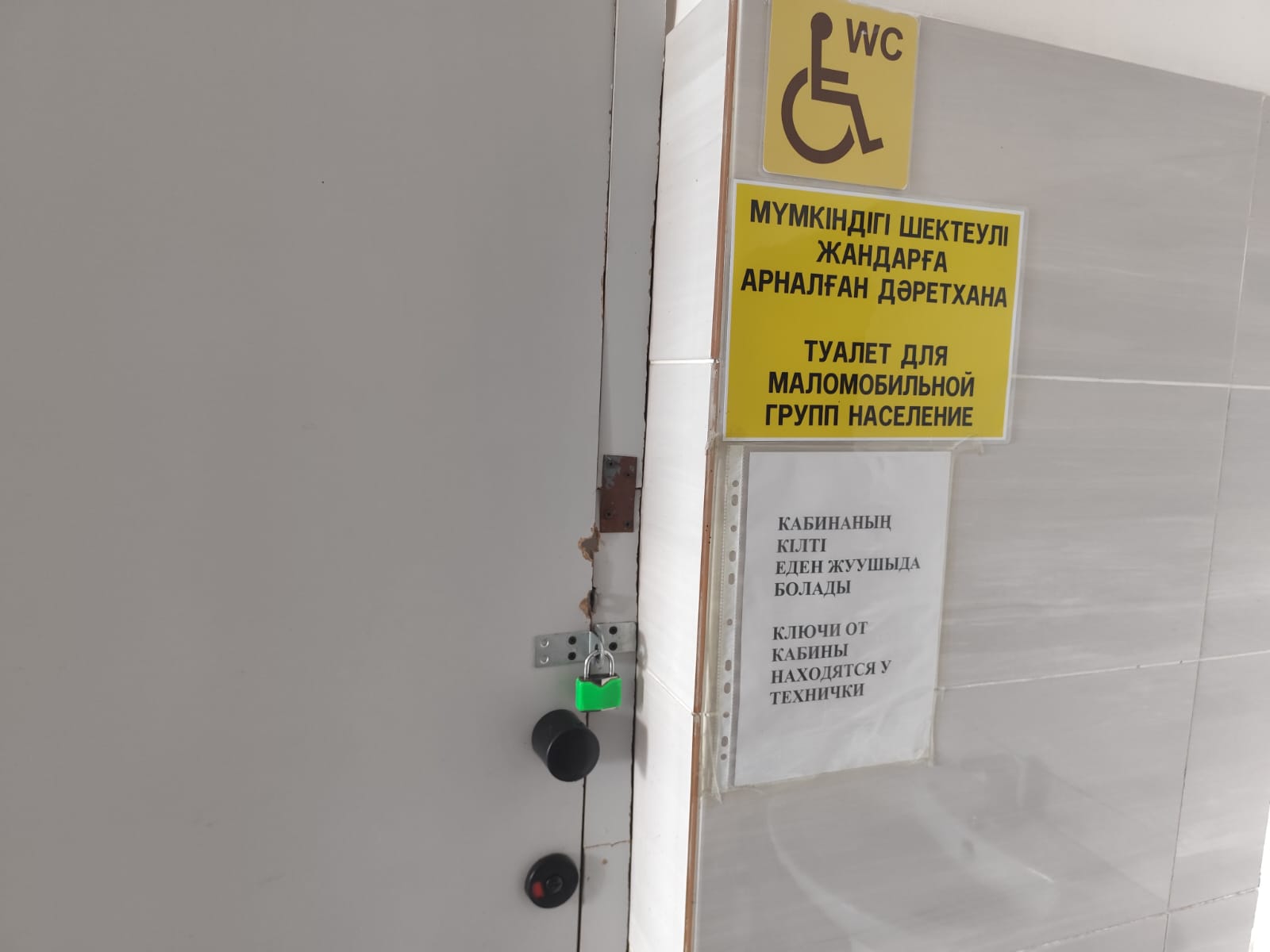 Но закрытая на кокетливый зелёный замок кабинка туалета, предназначенного для людей с инвалидностью, вызывает одновременно шок и возмущение. На стене висят два объявления: "Туалет для маломобильной групп население" (орфография сохранена) и "Ключи от кабины находятся у технички". Следовательно, женщине на инвалидной коляске необходимо отправиться на розыски уборщицы, попросить у той ключ и вернуться обратно. А если технички не оказалось на месте и она куда-то ушла?!