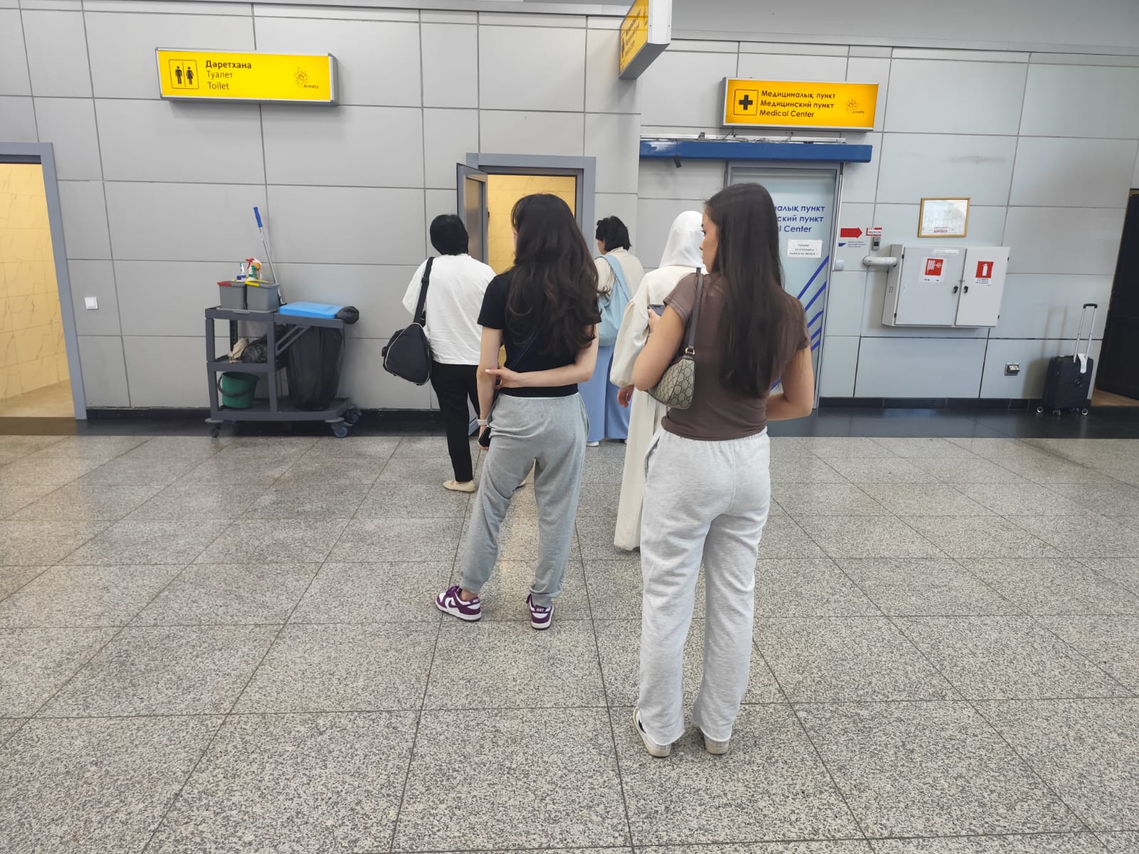 В туалетах терминала аэропорта Алматы, обслуживающего внутренние рейсы, в целом неплохо. Уборщицы порядок поддерживают. Но на первом этаже функционирует всего лишь один туалет, и возле него постоянно собирается внушительная очередь, что создаёт неудобства и вызывает дискомфорт. Недовольны сложившейся ситуацией и алматинцы, прилетающие домой, и гости города, и продавцы бутиков, вынужденные порой на 15–20 минут закрывать торговые точки, потому что поход в туалет затягивается.