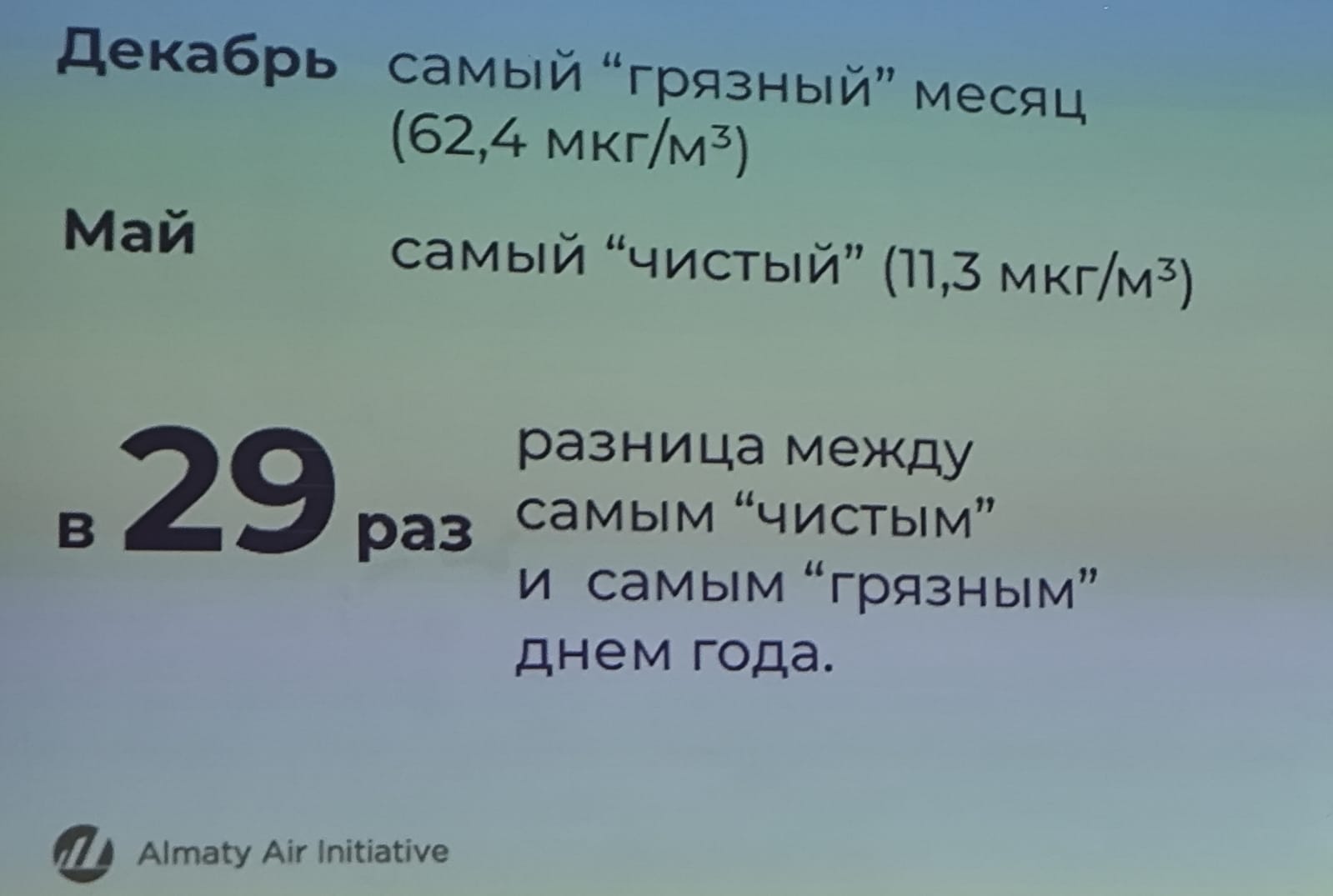 "Городской смог состоит из смеси разных загрязнителей. Помимо частиц PM2.5, PM10 в воздухе присутствуют диоксид азота (NO2), диоксид серы (SO2), угарный газ (CO), озон (O3) и другие вещества. В нашем исследовании мы сделали фокус на PM2.5 – на наиболее опасном и репрезентативном показателе загрязнения воздуха. Мы выяснили, что более 60% дней в году жители города дышали воздухом, не соответствующим международным стандартам безопасности. Количество "чистых" дней сократилось до 148, в прошлом году их было на 16 больше. Наиболее тяжёлая ситуация зафиксирована в зимние месяцы", – подчеркнула исполнительный директор фонда Almaty Air Initiative Жулдыз Саулебекова.