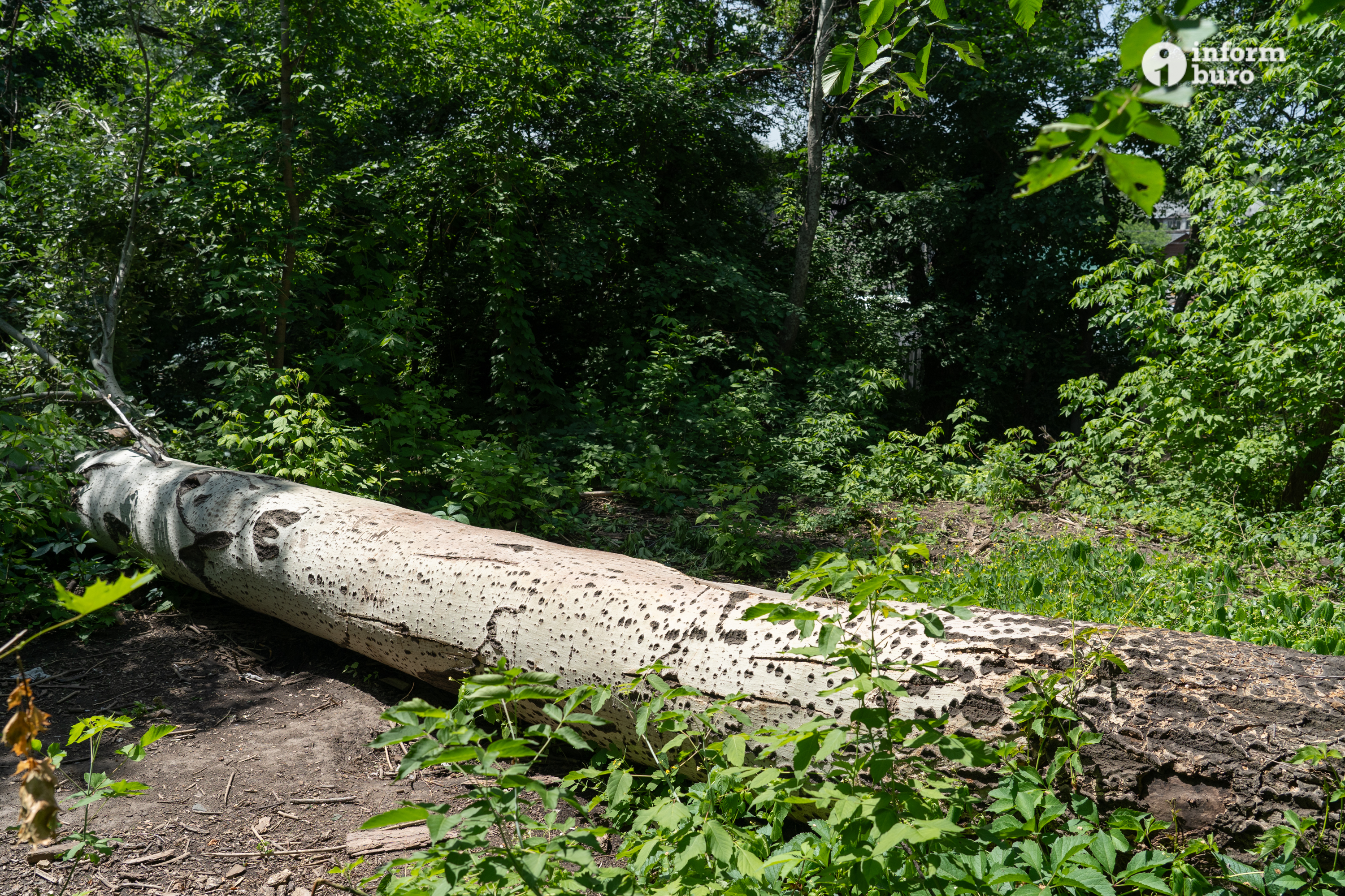 "Деревья тут пилят, пилят и на машинах вывозят. Мы сами видели, как отсюда увозили нормальные здоровые деревья. А вся эта дряхлость – лежащие сгнившие стволы – так и остаётся на месте. Вон то дерево, например, давно упало, почему до сих пор не убрали? Зато хорошие – срубают. Был как-то выходной, какой-то праздник, и вечером, когда уже стемнело, начали вывозить деревья. Люди снимали и выкладывали это в Instagram. Мы всё это видим. Честно говоря, не ждём ничего хорошего от "улучшений", которые нам обещают. Говорят, что старые деревья нужно менять, но ведь это нужно делать постепенно, а не вырубая всё подряд".