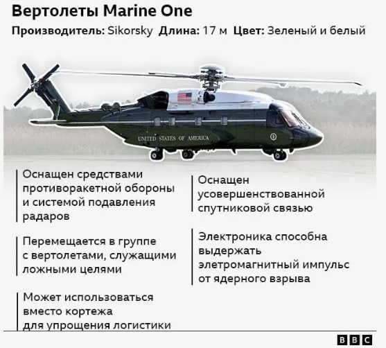 Президент, вероятно, привезёт с собой в Великобританию целый парк вертолётов, среди которых будет Marine One. Так называется любой вертолет Корпуса морской пехоты США, который перевозит президента США.