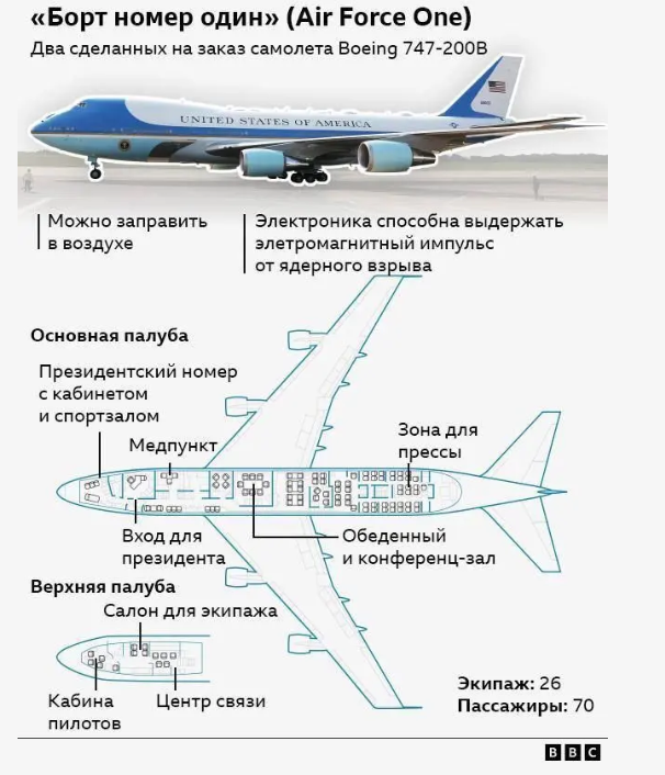 Air Force One на самом деле не является названием одного конкретного самолёта – так называют любой самолёт, на котором летит президент США. В основном для полётов президент использует один из двух самолётов серии Boeing 747-200B с бортовыми номерами 28000 и 29000, сделанных на заказ специально для перелётов лидера США.