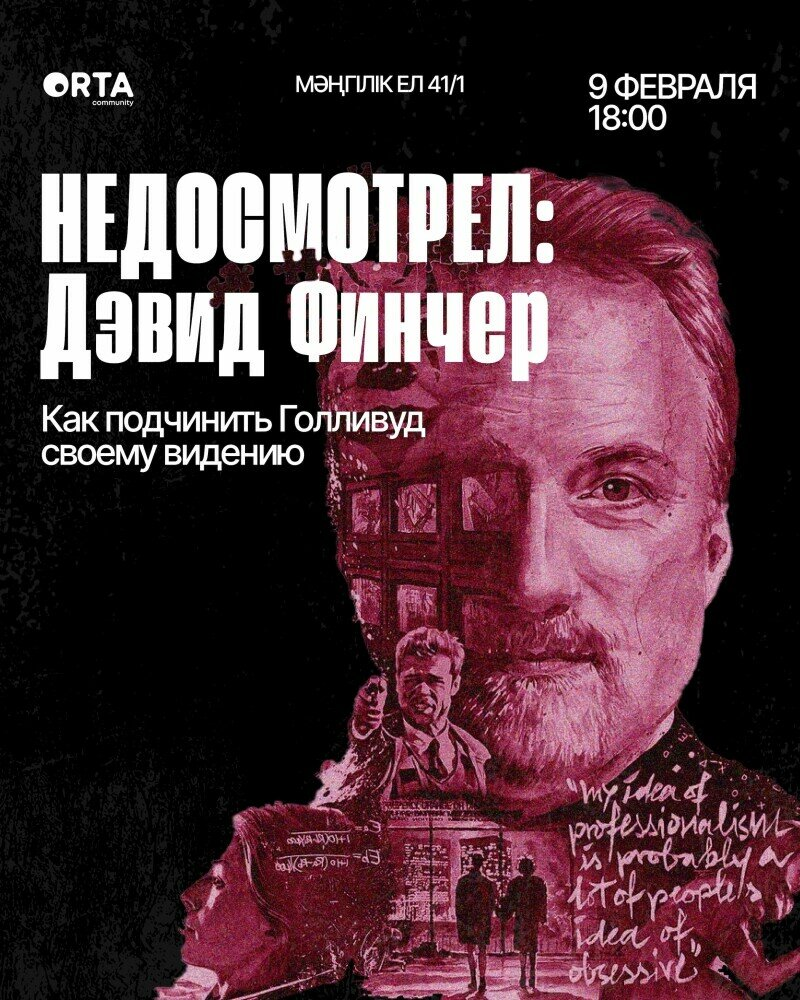 9 февраля в 18.00 в Orta Community пройдёт кинолекция "Недосмотрел. Дэвид Финчер: как подчинить Голливуд своему видению". Первую встречу нового проекта "Недосмотрел" посвятят культовому режиссёру Дэвиду Финчеру. Спикер Диль расскажет о его творческом пути, интересных фактах из жизни и уникальном режиссёрском стиле. Стоимость билета – 3000 тенге.