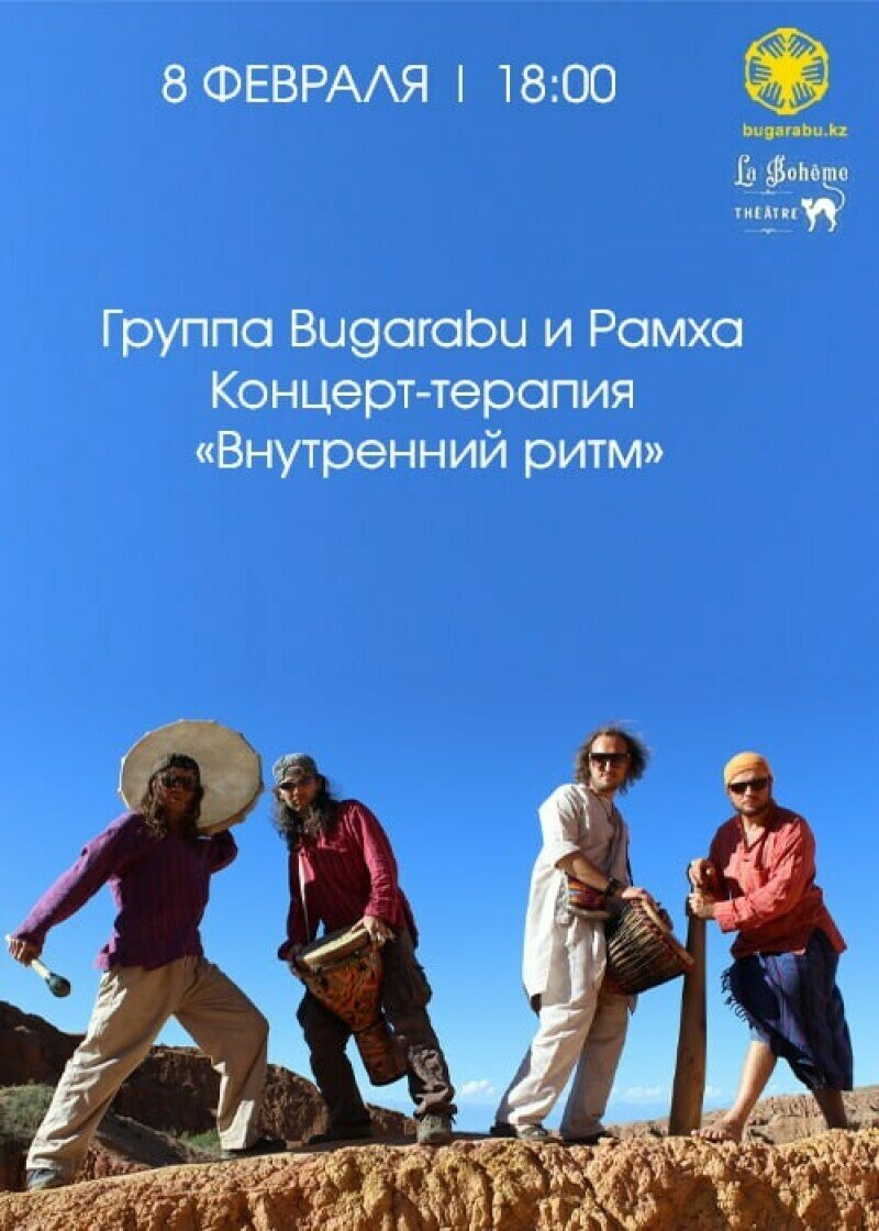 8 февраля в 18.00 в "La Bohême Театр" состоится концерт-терапия "Внутренний ритм" от группы Bugarabu и Рамхи. Константин Ramkha – мастер игры на диджериду, а Bugarabu исполнят ритмы на аутентичных инструментах: индийских табла, африканских джембе, восточных барабанах и шаманских бубнах. Стоимость билетов – от 6000 тенге.