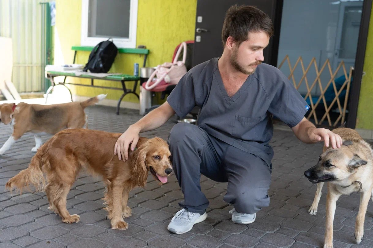 Кинолог параллельно отрабатывает с четвероногими посетителями тренажёрного зала коммуникативные навыки и по запросу корректирует поведение собак.