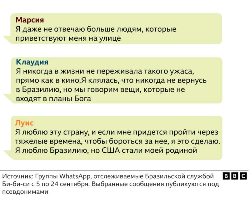 Это не единственное предупреждение. Другой иммигрант призвал членов группы выглядеть более "по-американски", например, не выводить на улицу детей, говорящих по-португальски, носить солнцезащитные очки и наклеить на машину стикеры в поддержку Трампа.