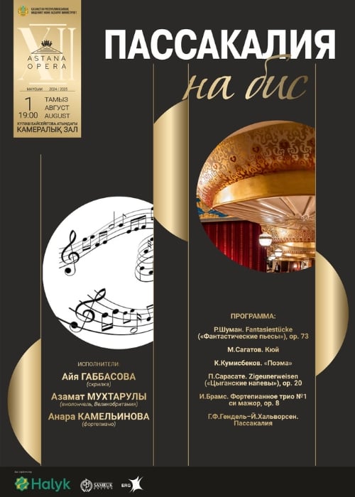 1 августа в 19.00 в Astana Opera пройдёт концерт камерной музыки. В программе популярные сочинения композиторов эпохи барокко, европейских романтиков и казахстанских авторов. Стоимость билетов – от 5000 тенге.
