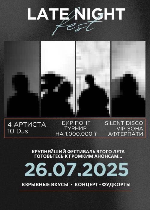 26 июля в 13.00 в OFFTOP CLUB состоится фестиваль Late Night Fest. Помимо еды и напитков гостей праздника ожидают диджейские сеты, четыре хедлайнера масштаба СНГ, бир-понг-турнир с призом в один миллион тенге. Стоимость билетов – от 15 000 тенге.