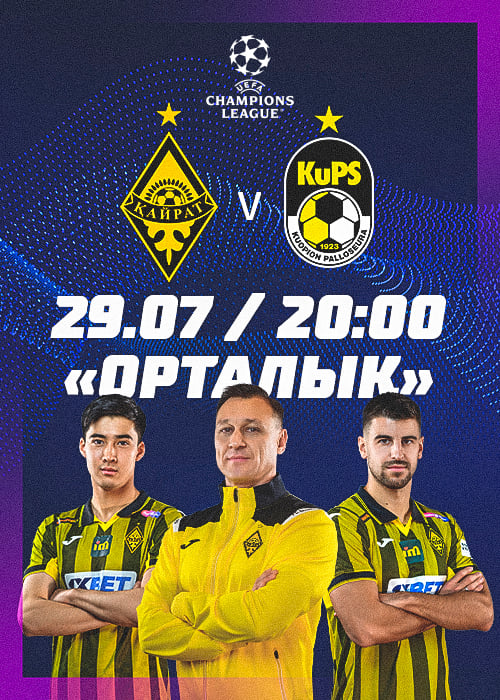 29 июля в 20.00 на Центральном стадионе состоится футбольный матч, где ФК Кайрат" примет на своём поле чемпиона Финляндии "КуПС". Стоимость билетов – от 1000 тенге.