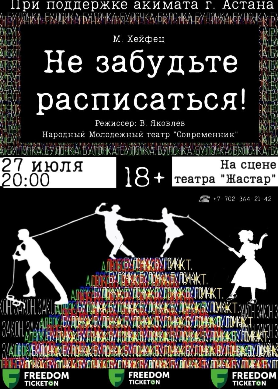 27 июля в 20.00 на сцене театра "Жастар" пройдёт спектакль "Не забудьте расписаться!", комедия в жанре социальной утопии советского и израильского автора Михаила Хейфеца. Стоимость билетов – от 3000 тенге.