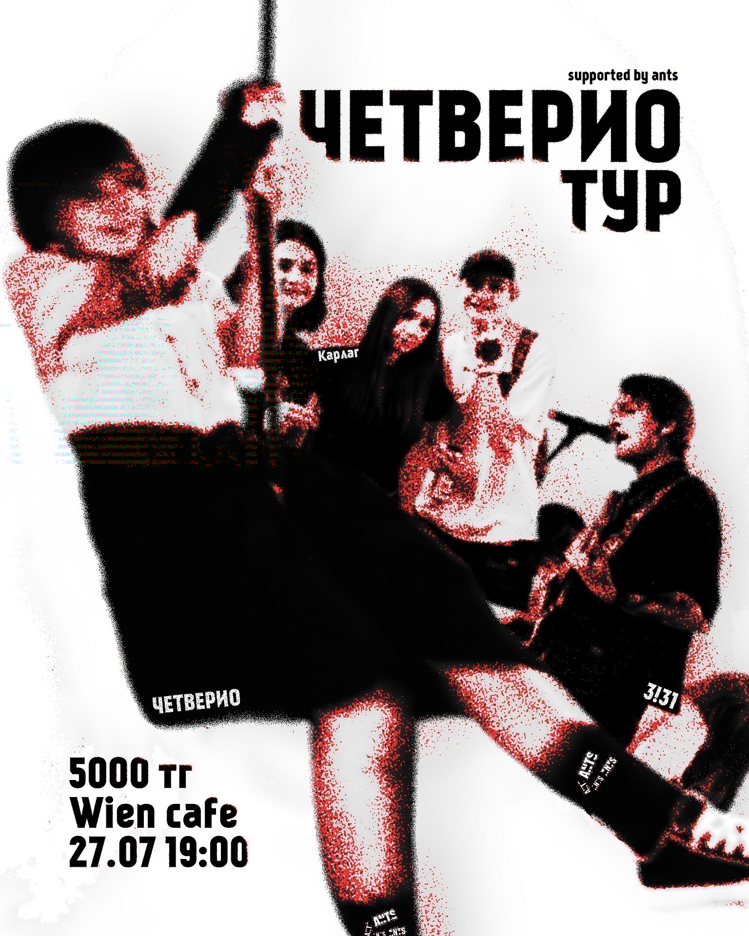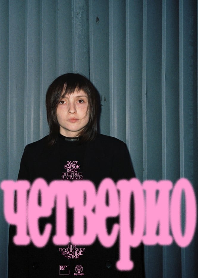 27 июля в 19.00 в Bar Wien состоится концерт панк-группы "Четверио". В Астане их выступление пройдёт при поддержке групп "Карлаг" (панк) и "3!31" (инди). Главными темами песен будут любовь на фоне войны, квир-репрезентация. Стоимость билетов – от 5000 тенге.