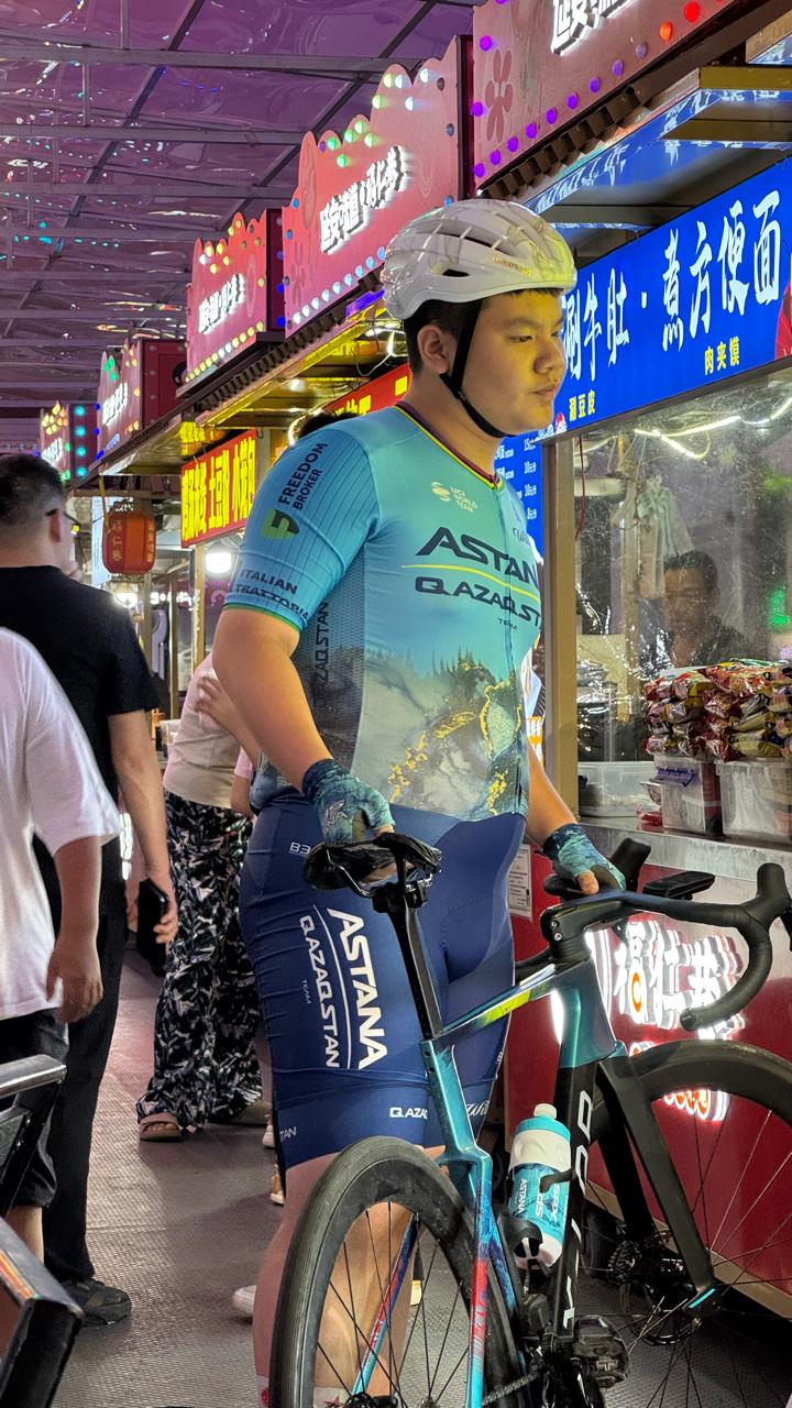 Мы остановились перекусить, купив напитки и стритфуд, и заметили подростка-велосипедиста в форме с надписью Astana. Оказалось, он фанат казахстанской велокоманды Astana Qazaqstan Team. Подросток плохо говорил по-английски, разговор вышел недолгим, но тёплым.