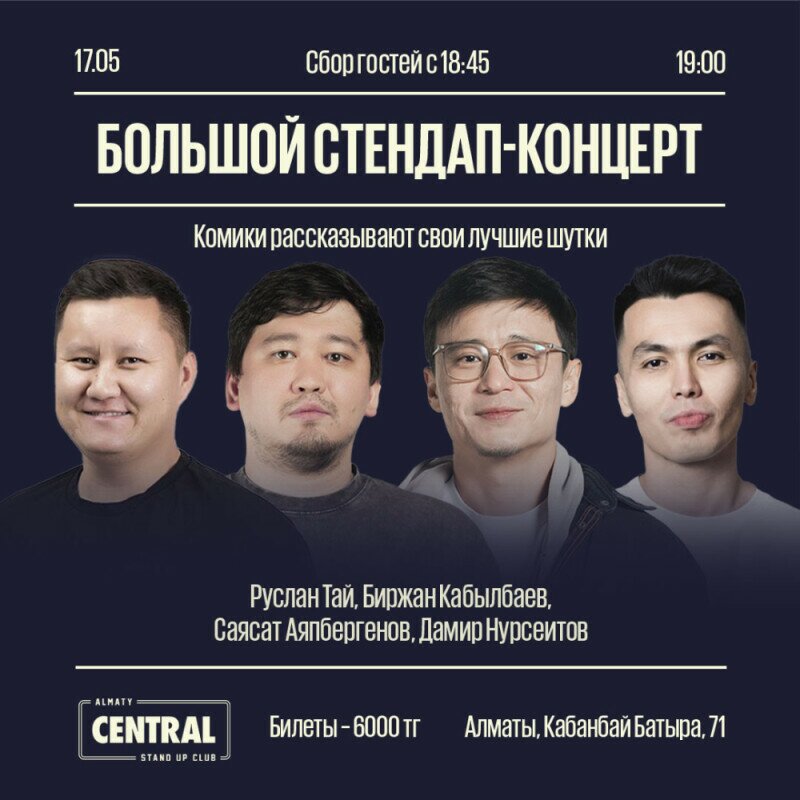 17 мая в 19.00 в Central Stand Up Сlub выступят алматинские комики. Новые шутки представят Руслан Тай, Биржан Кабылбаев, Саясат Аяпбергенов и Дамир Нурсеитов. Стоимость билетов – от 6000 тенге.