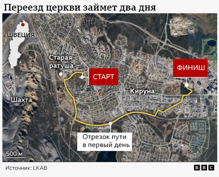 В самом северном городе Швеции Кируне осуществляется уникальный проект: здание церкви, построенной в 1912 году, целиком перевезут на другой конец города. Погруженное на гигантскую платформу на колесах сооружение проделает путь в пять километров. Ожидается, что поездка займёт два дня, так как двигаться процессия будет с максимальной скоростью 500 метров в час.