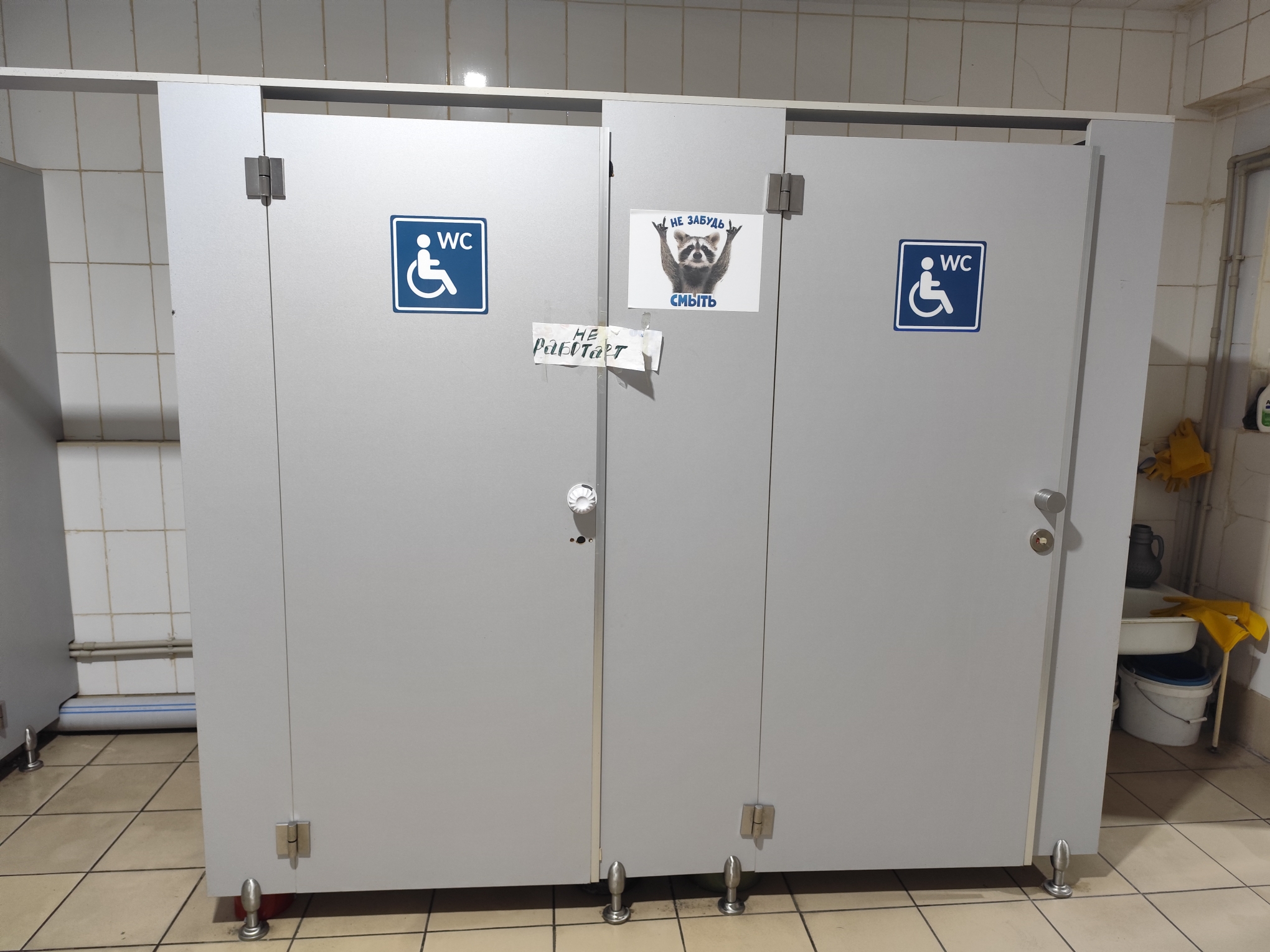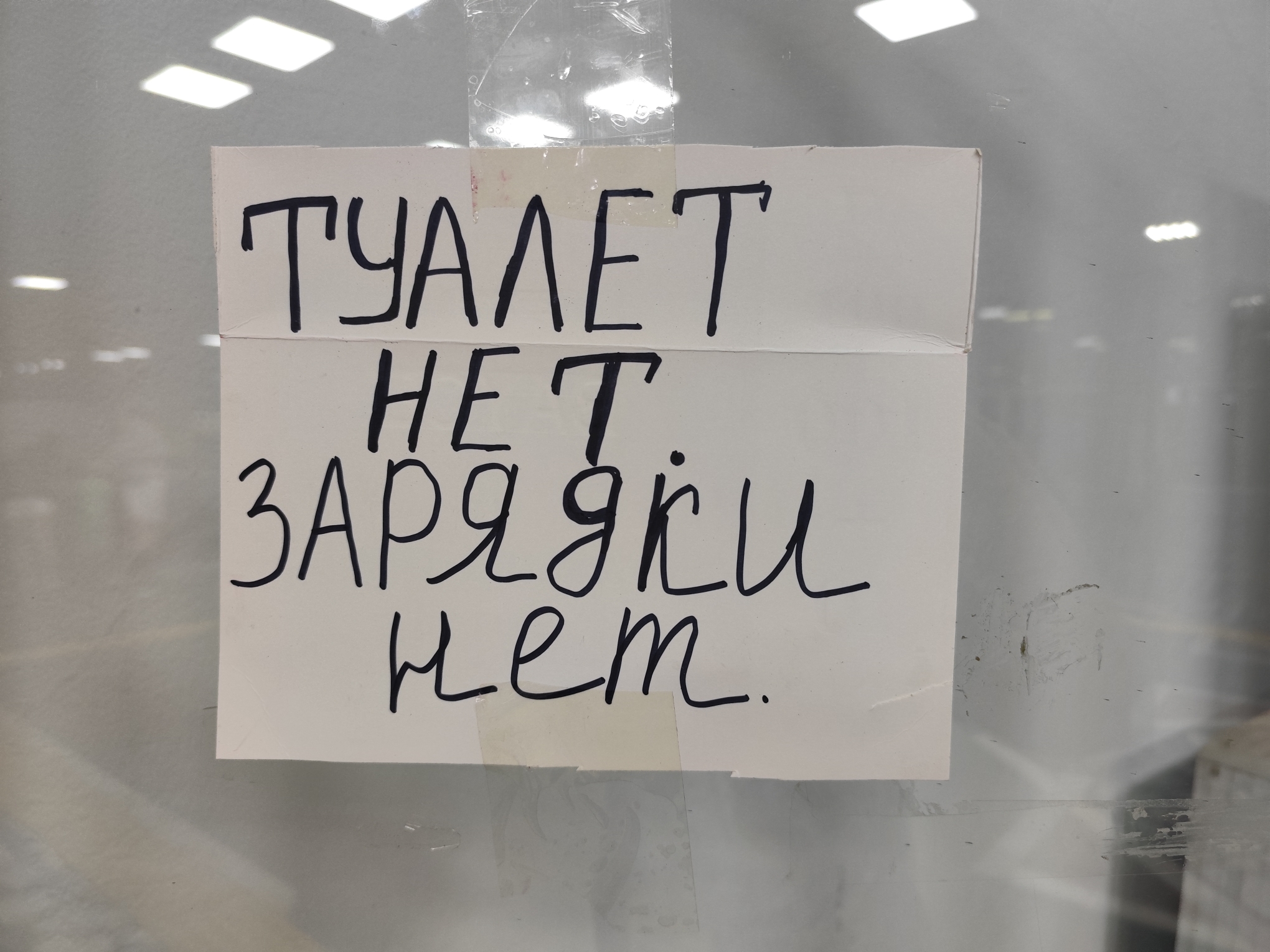 На дверях столовой (вход из зала ожидания) висит объявление, написанное от руки и гласящее: "Туалет нет, зарядки нет".