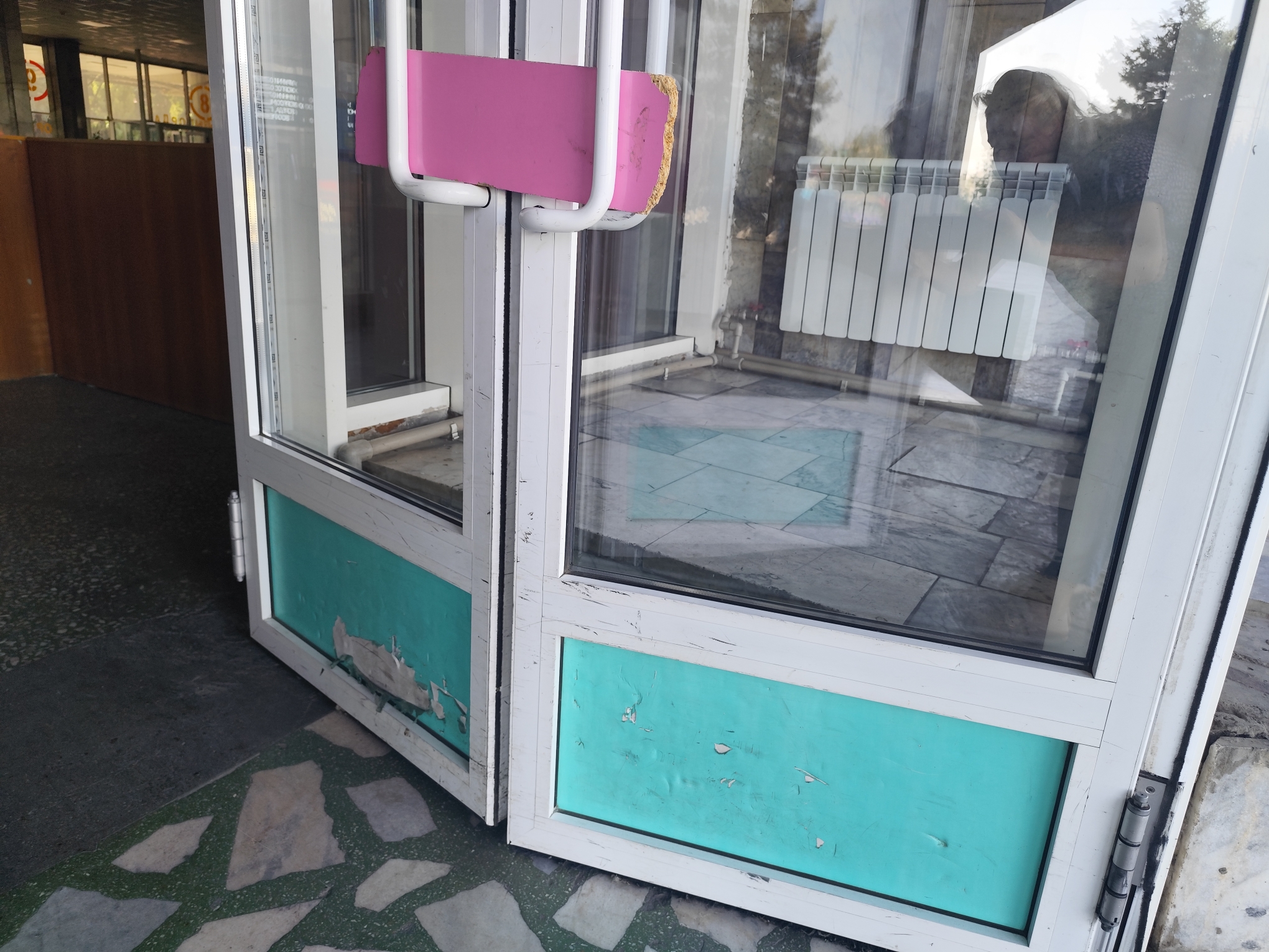 Шокируют входные двери, подпёртые выкрашенными в розовый цвет дощечками, над которыми будто бы потрудились мыши. На нижней части дверей краска облупленная.