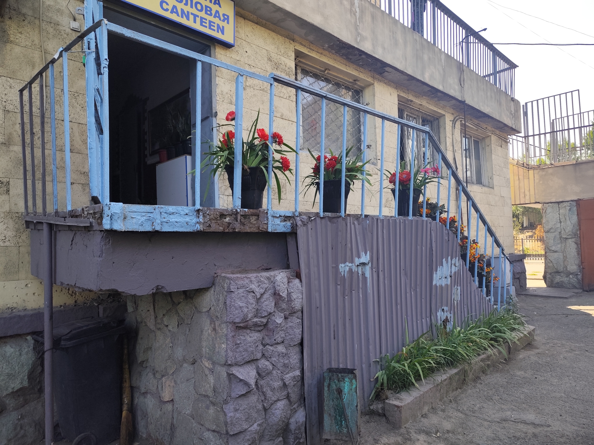 Вход в столовую с торца украшает вывеска на трёх языках: казахском, русском и английском. На ступеньках, видимо, для пущей красоты и соответствия международному статусу, установлены горшки с искусственными цветами. "Шикарный" вид дополняют ограждение с трещинами, замазанными как попало голубой краской, и покосившаяся обшарпанная одноногая скособоченная урна.