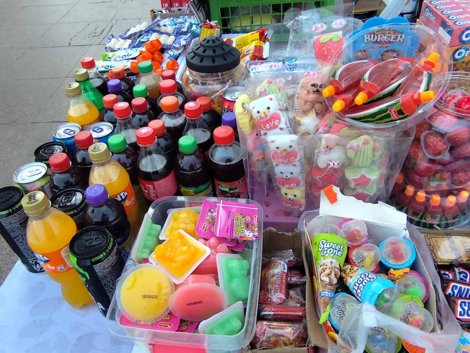 У главного входа в парк уютно расположились предприимчивые продавцы. Игрушки они выложили прямо на асфальт, на импровизированном прилавке на жаре рядами выставили бутылки с газировкой, упаковки курта, снеки, шоколадки, жевательную резинку и фруктовые пюре, предназначенные для малышей четырёх-шести месяцев.