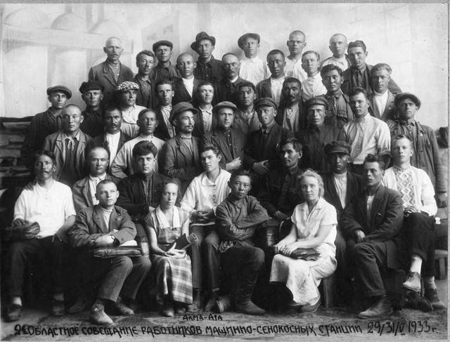 А на этой фотографии, снятой 31 мая 1933 года в Алма-Ате – участники 2-го областного совещания работников машинно-сенокосных станций. Что такое машинно-сенокосные станции? Сейчас это уже мало кого волнует. Но в 33-м году, судя по снимку, знатоков, руководителей и простых "станционных смотрителей" было куда больше. Вглядитесь в эти лица. Это смотрит на нас не только абстрактное ушедшее. Возможно, кто-то из вас сейчас глядит в глаза своему деду или прабабушке.
