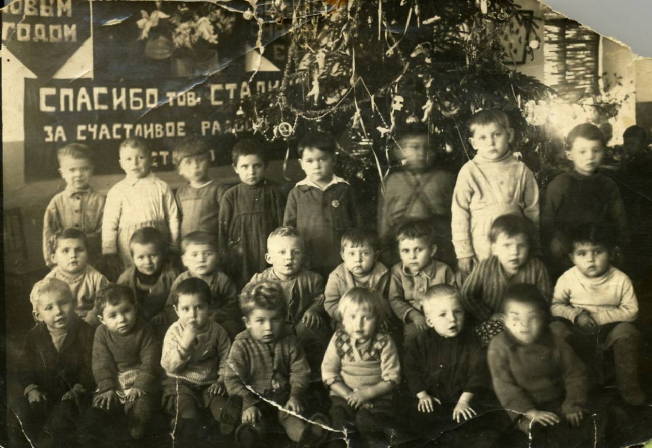 Ещё одно редкое фото из моего архива – празднование Нового, 1940-го года, в детском саду им. Ленина города Уральска. Всё при всём – ёлка на своём месте, напуганные фотографом детишки и благодарность за счастливое детство – тоже на месте. Возраст детишек, запечатлённых на этом снимке, перевалил сегодня за 80 лет. Не исключено, что некоторые ещё живы.
