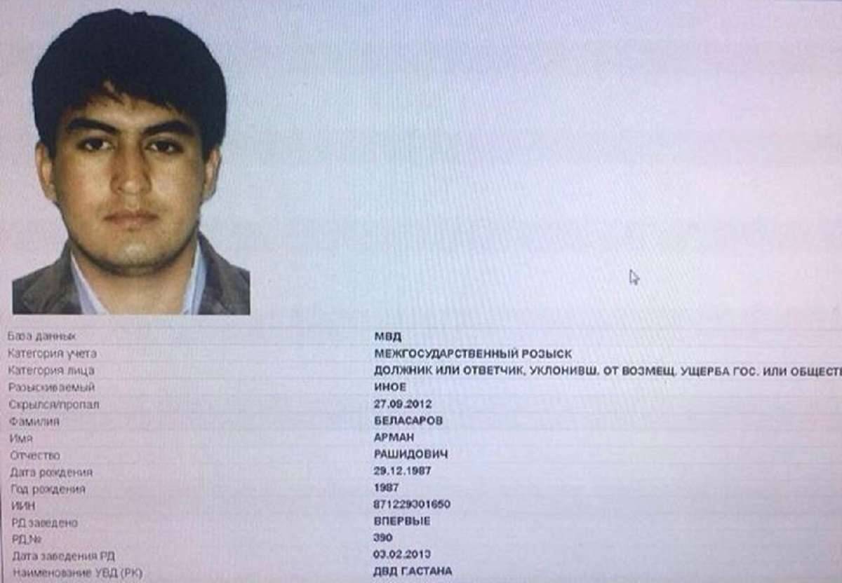 Согласно официальному заявлению Управления полиции города Астаны, 11 октября 2011 года Арман Беласаров был заочно осуждён Алматинским районным судом Астаны. А с 5 января 2012 года решение суда вступило в законную силу, но деньги от его семьи в Казахстане получить не удалось. Поэтому 24 сентября 2013 года Министерство внутренних дел объявило Армана Беласарова в международный розыск.