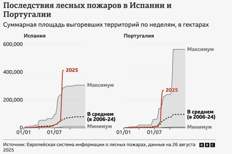 Испания и Португалия пострадали особенно сильно: по данным учёных ЕС, выгорел примерно 1% всей территории Пиренейского полуострова.