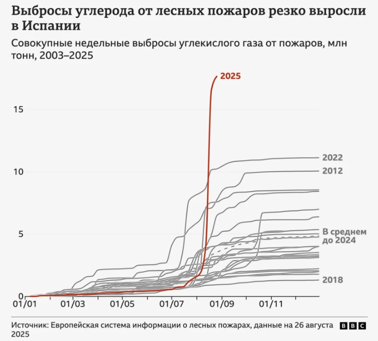 По данным ЕС, объём CO₂, выброшенного в результате пожаров в Испании в этом году, достиг рекордных 17,68 млн тонн. Это больше, чем общий годовой объём выбросов CO₂ от лесных пожаров в этой стране с 2003 года, когда данные впервые стали регистрировать с помощью спутников.