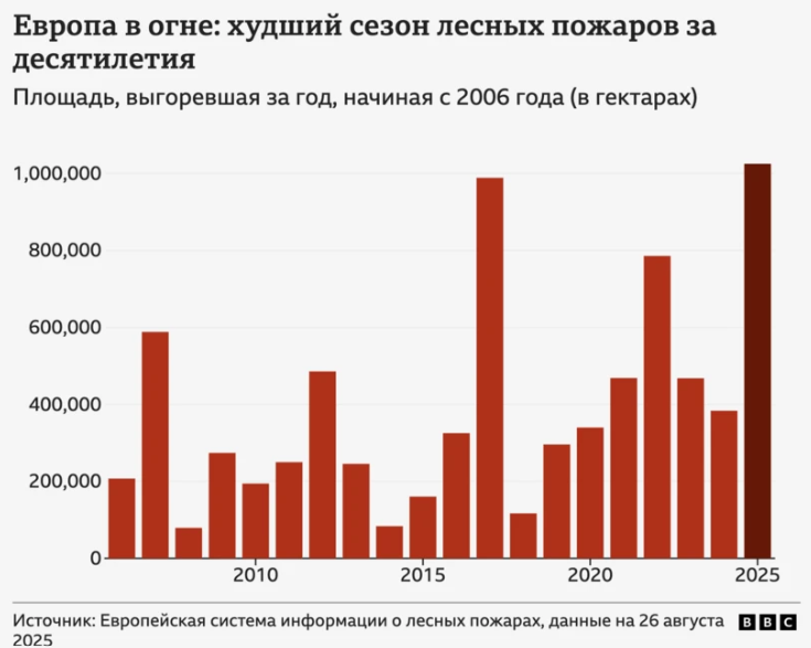 В этом году в странах Европейского союза выгорело рекордное количество лесов – один миллион гектаров. Это самый тяжёлый сезон лесных пожаров с 2006 года, когда в Европе начали вести эту статистику.