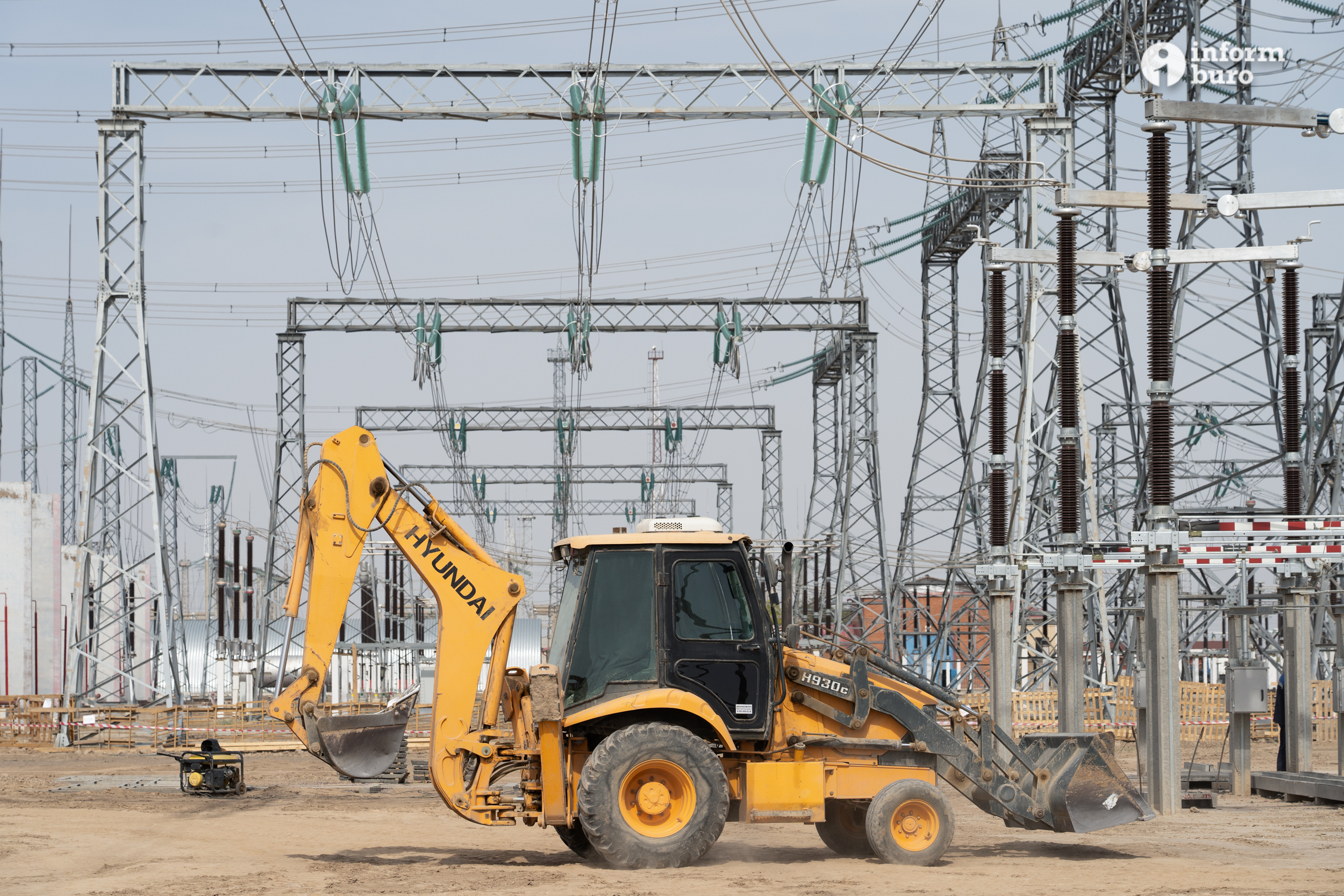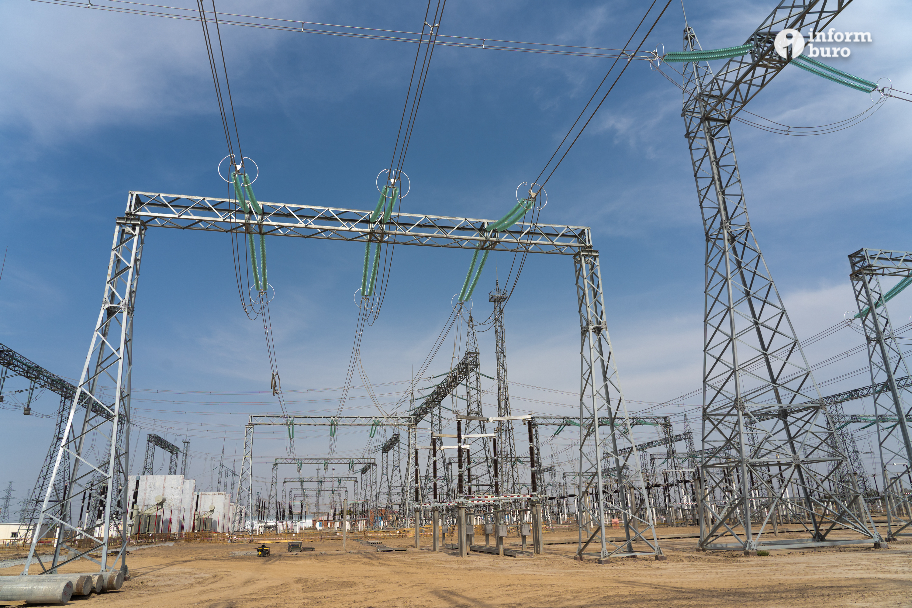 На подстанции Шу 500 кВ завершены планировочные работы, установлены приёмные порталы для подключения новой линии, смонтированы четыре фазы реакторов (500 кВ), команда проводит монтаж коммутационного оборудования.