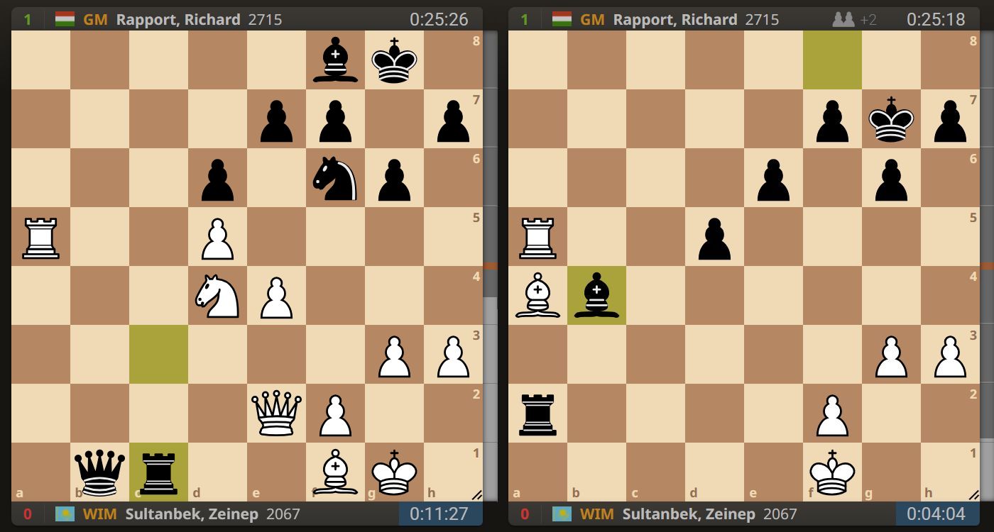 Пятый тур. На первой доске лидерская междоусобица WIM Зейнеп Султанбек (2067, Казахстан) – GM Рихард Раппорт (2715, Венгрия). Представить такое перед началом турнира было просто невозможно, но так оно и случилось. Более того, после 36-го хода чёрных партия клонилась к ничьей, но тут белые вместо скромного 37. Крg2 сыграли псевдоактивно 37. Лb5?? – и после 37. …Ф:e4 38. Ф:e4 К:e4 39. Крg2 (поздно!) Лd1 40. Лb4 Кc3 41. Кc6 К:d5 42. Лd4 Лc1 43. Л:d5 Л:c6 у чёрных две лишние пешки. На 53-м ходу белые сдались.