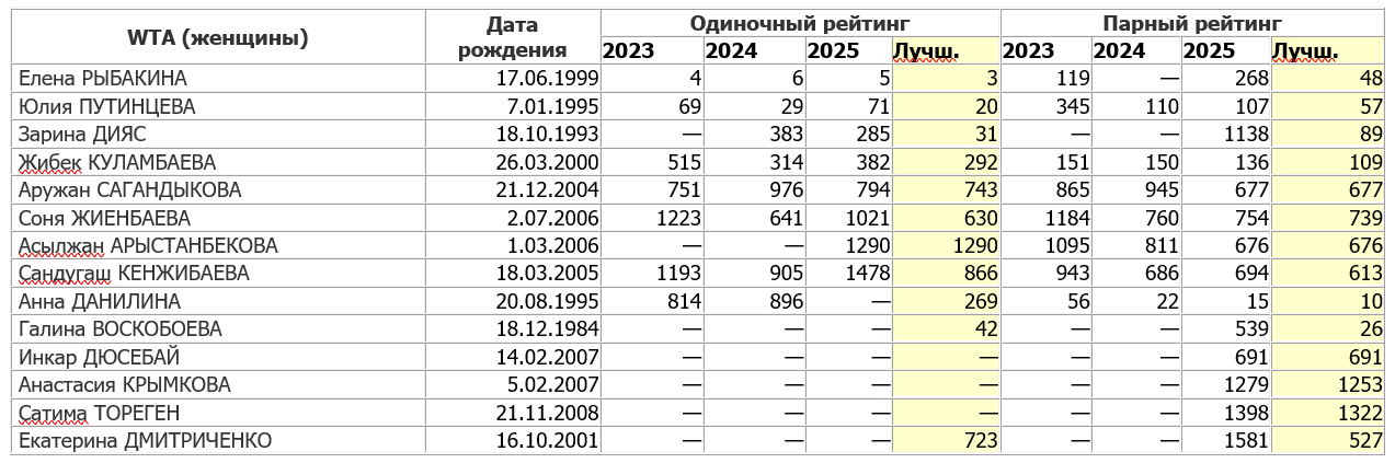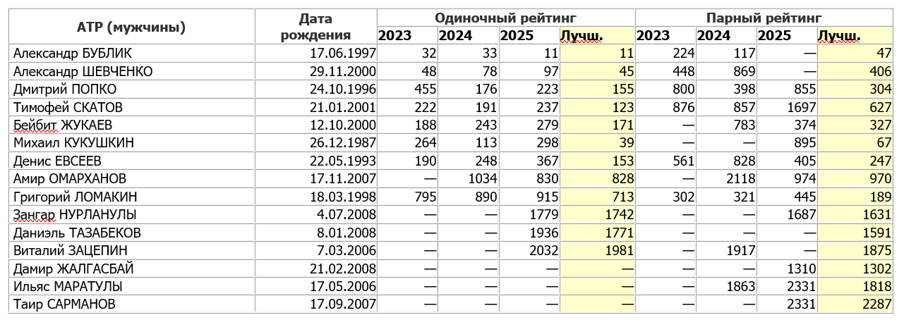 Для сравнения: в конце декабря 2015 года, то есть ровно 10 лет назад, в рейтингах были лишь семь казахстанских теннисистов среди мужчин (по рейтингу – Михаил Кукушкин, Андрей Голубев, Александр Недовесов, Дмитрий Попко, Денис Евсеев, Тимур Хабибулин и Роман Хасанов) и 11 – среди женщин (Зарина Дияс, Ярослава Шведова, Юлия Путинцева, Галина Воскобоева, Камила Керимбаева, Анна Данилина, Екатерина Клюева, Александра Гринчишина, Екатерина Губанова, Гозаль Айнитдинова и Анастасия Епишева).