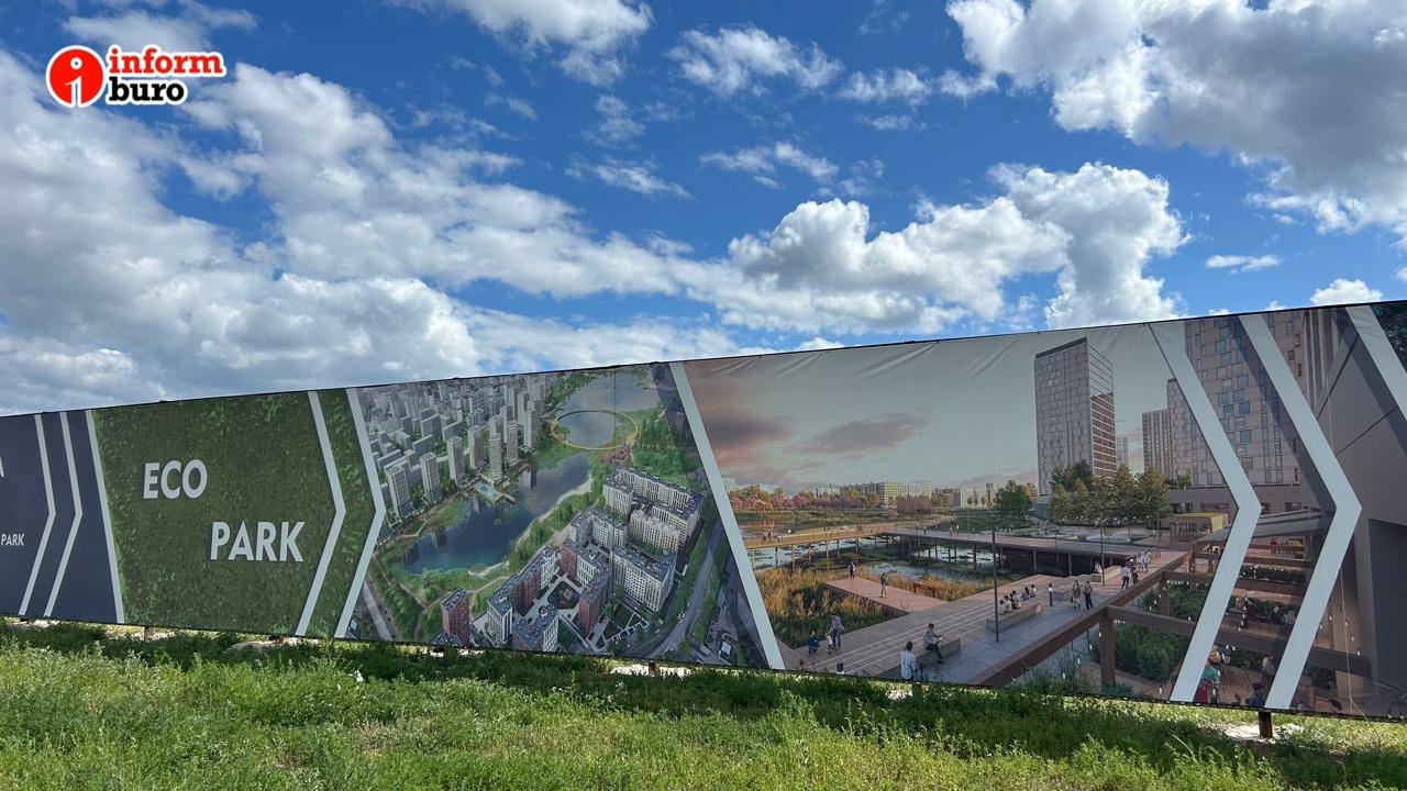 Со стороны улицы Сыганак, напротив Зелёного квартала, на ограде установили баннеры с эскизами планируемого экопарка, который власти обещают начать строить уже третий год подряд.