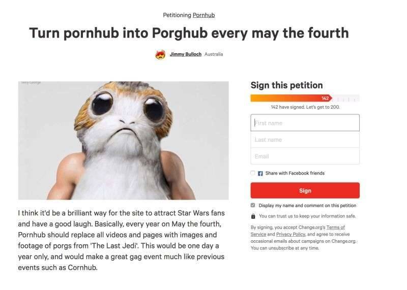 Один из пользователей интернета предложил популярнейшему порносайту Pornhub ("Порнхаб") каждый год отмечать день "Звёздных войн" и становиться "Поргхабом". То есть заменять свой контент на картинки и видео с поргами. По мнению организатора петиции, такой ход стал бы отличной шуткой и привлёк бы новых посетителей на сайт. Вот только вряд ли продюсеры из Disney согласятся на такое использование их умилительных зверюшек.