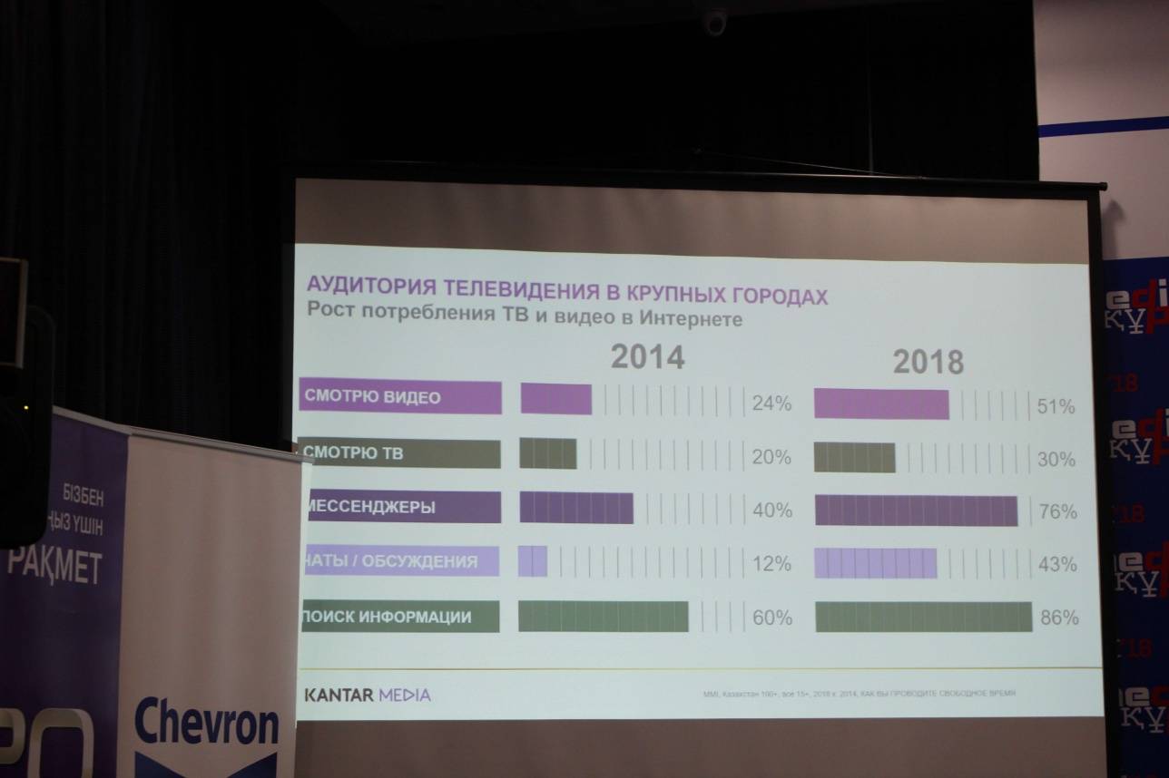 Данные телесмотрения казахстанских телеканалов по 2017 год представила Татьяна Старцева, генеральный директор TNS Central Asia, организации, которая является ведущим и единственным измерителем ТВ в стране. 61% казахстанцев смотрит казахстанское ТВ ежедневно, и в среднем 91% – ежемесячно. В 2013-17 годы казахстанцы стали на 43% реже смотреть телевизор и ещё на 12% телесмотрение упало в 2018-м по отношению к прошлому году.
