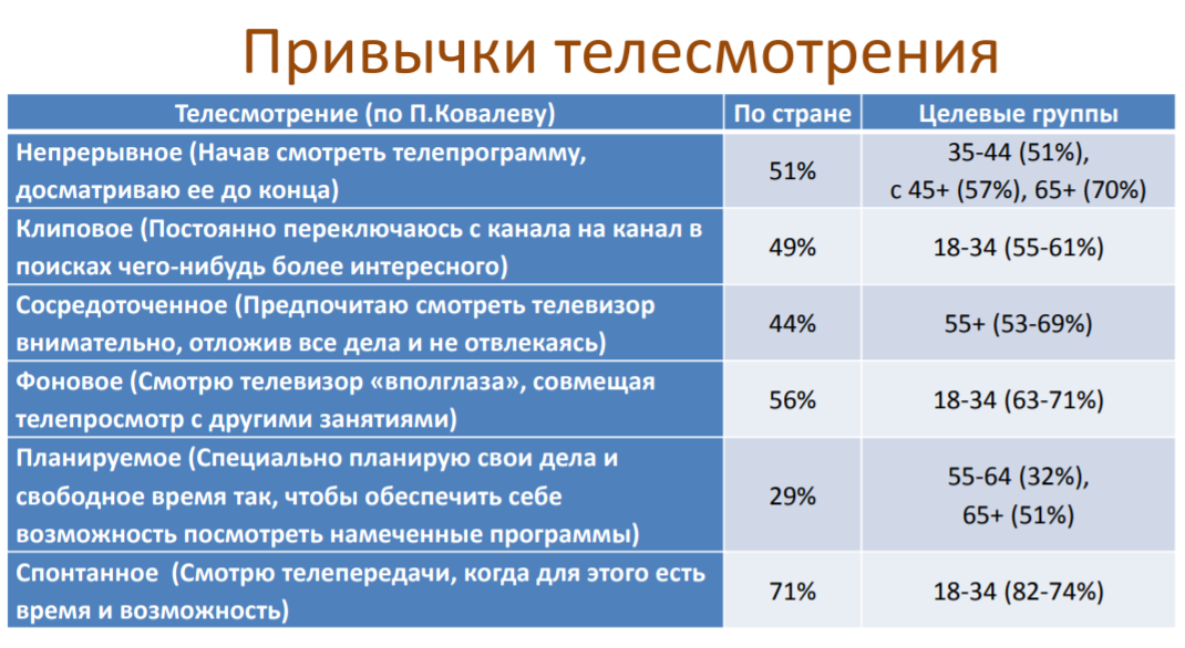 В крупных городах телевизор теряет свои позиции в потреблении контента, что выглядит так: телевидение – 49%, интернет- 35%, радио – 14%, печатные издания – 2%.