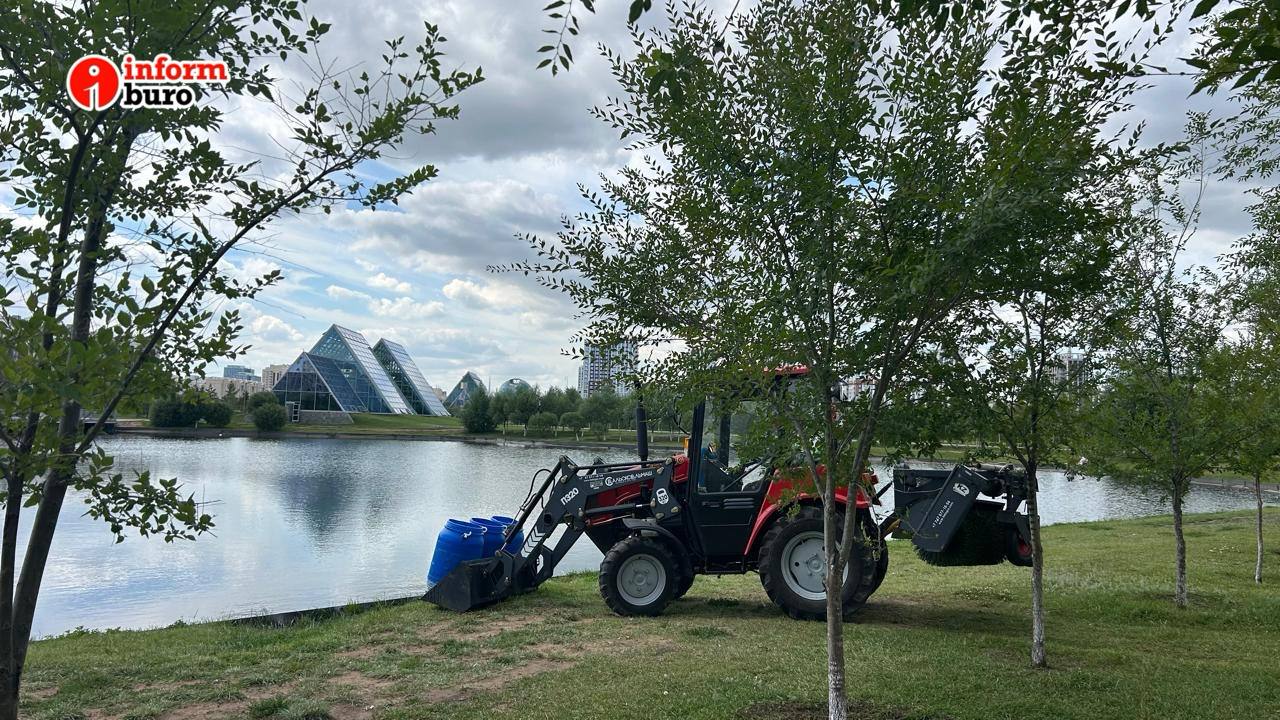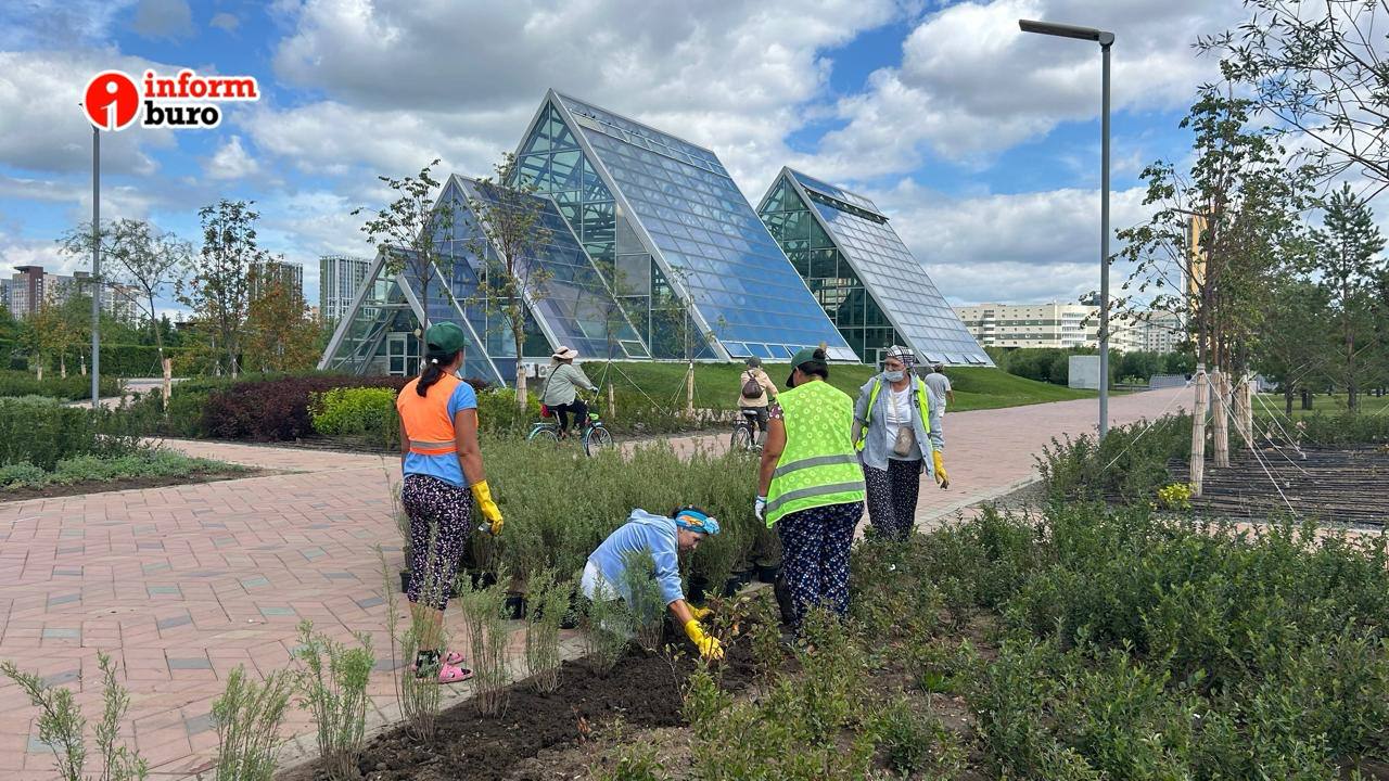 Вся эта работа держится на таких людях, как уроженка посёлка Оразак Акмолинской области пенсионерка Макпал, которая работает озеленителем в парке с марта этого года. Каждый день с восьми утра и до пяти вечера за зарплату 270 тысяч тенге Макпал с коллегами занимается прополкой газонов от сорняков, посадкой цветов и уборкой засохших веток деревьев.