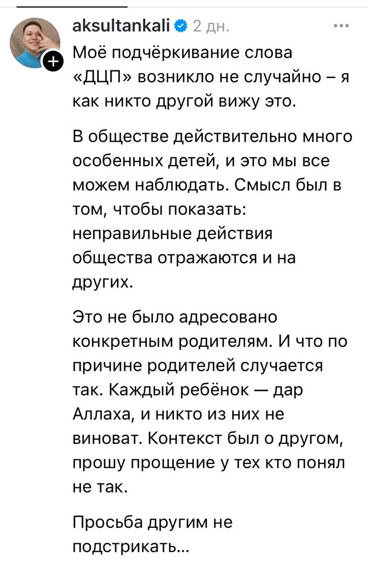 Юный блогер с аудиторией подписчиков свыше миллиона человек некто Аксултан Калиев решил высказаться по поводу причин рождения детей с ДЦП. Казахстанец утверждал, что главная причина появления на свет особенных детей – "прелюбодеяния" взрослых. Непонятно на чём основанное высказывание молодого человека вызвало возмущение не только семей, где живут больные детским церебральным параличом, но и всех неравнодушных казахстанцев.