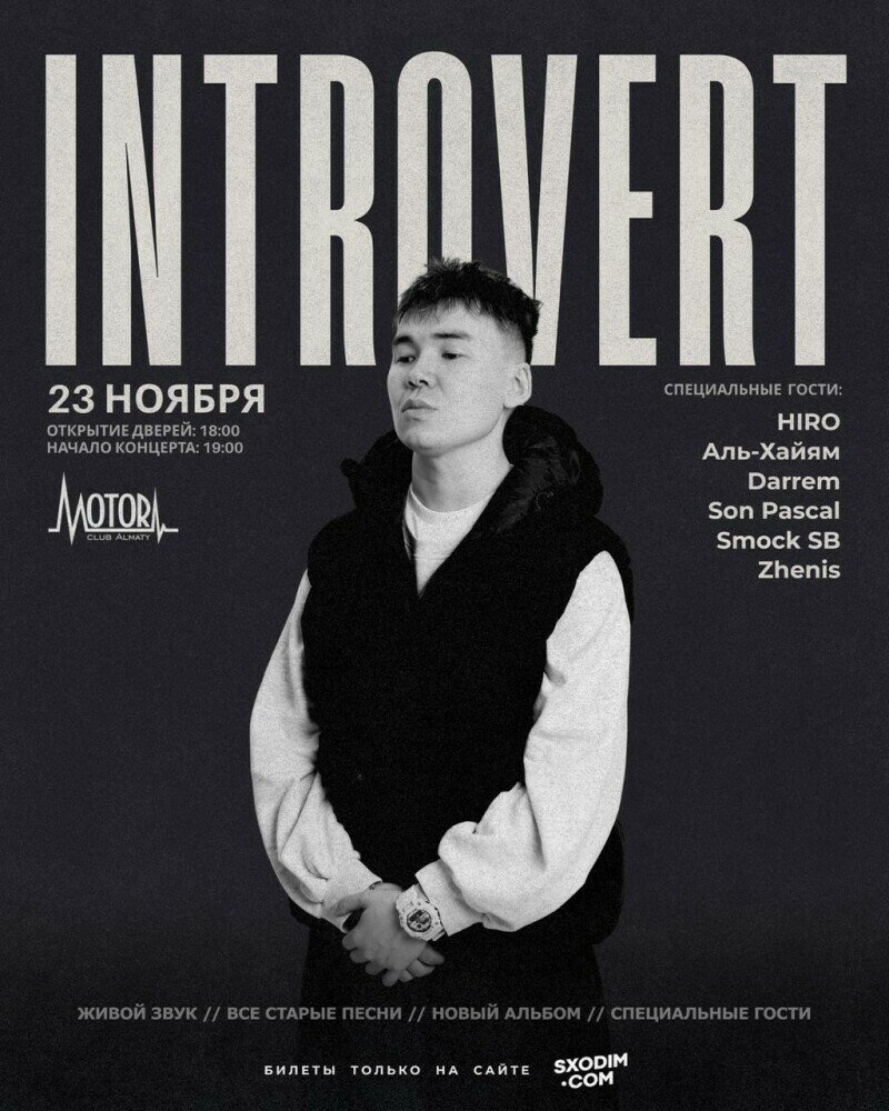 23 ноября в 18.00 в Motor Club пройдёт сольный концерт исполнителя INTROVERT. В программе вечера прозвучат все любимые старые композиции, а также новый альбом. Гостей ждут живой звук и выступления специальных приглашённых артистов: HIRO, Аль-Хайям, Darrem, Son Pascal, Smock SB, Zhenis и секретные гости. Стоимость билетов – от 8000 тенге.